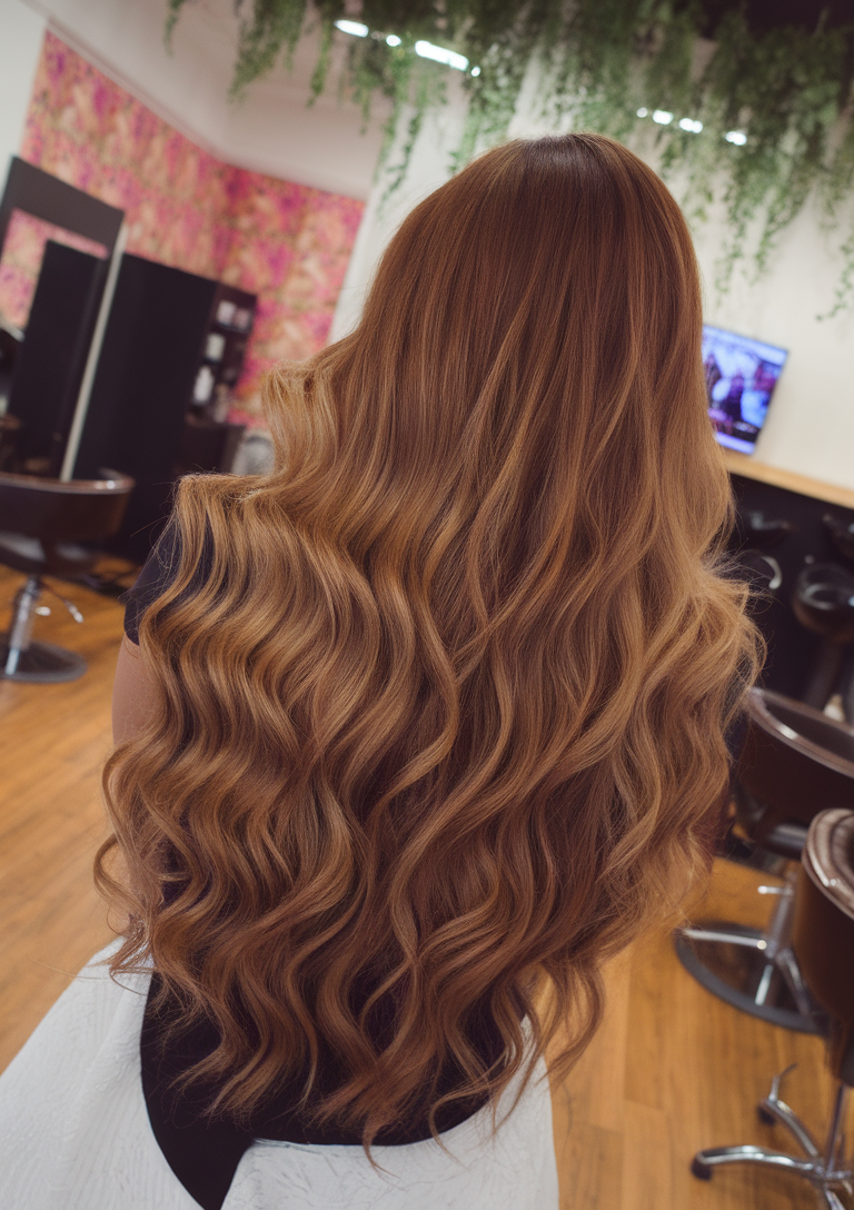 This hairstyle showcases rich, fiery copper tones with voluminous waves that exude warmth and vibrancy. The bold shade flatters Tone Latinas and Tone Indian, offering a bright and radiant look for spring hair color transformations. The soft, cascading waves add movement, making it a standout choice for a glowing and confident style.