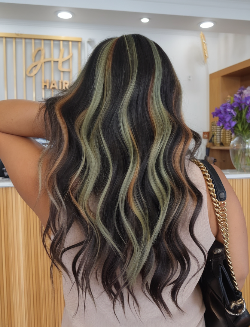 This bold hairstyle combines jet-black waves with striking peekaboo green highlights for an edgy, modern look. The contrast adds dimension, perfect for women who love adventurous spring hair choices. The wavy texture enhances the playful streaks, creating a dynamic and stylish effect. This is a good option for showcasing creativity and individuality.