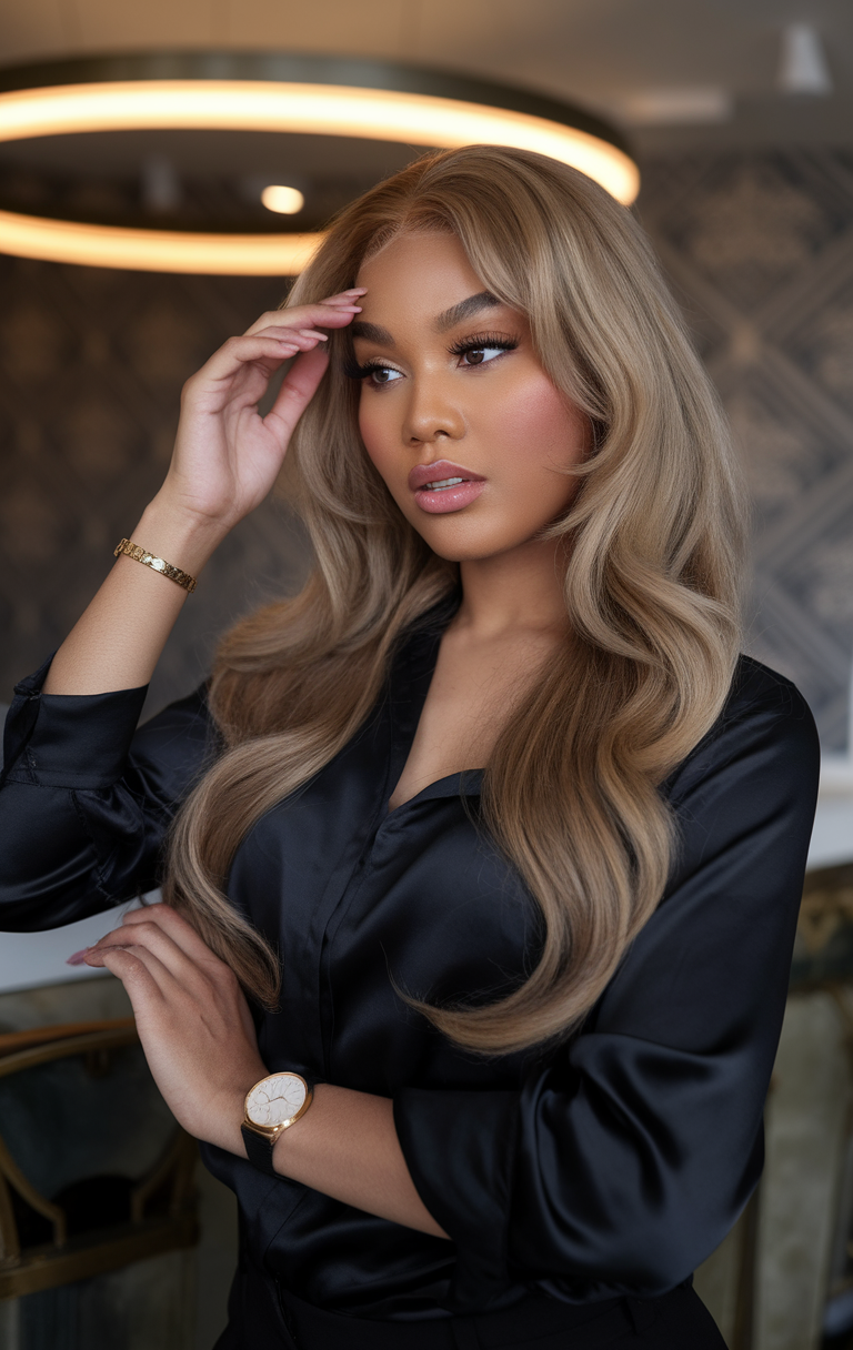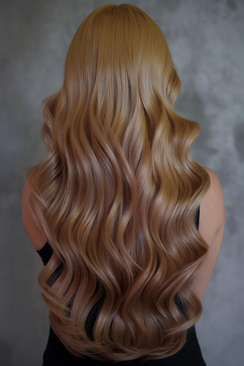 This hairstyle showcases soft, flowing honey blonde waves that exude warmth and radiance. The blended tones add natural depth and shine, making it a good choice for spring hair color for Black women 2025. Perfect for Tone Latinas or women looking for a light, sun-kissed look with plenty of volume.