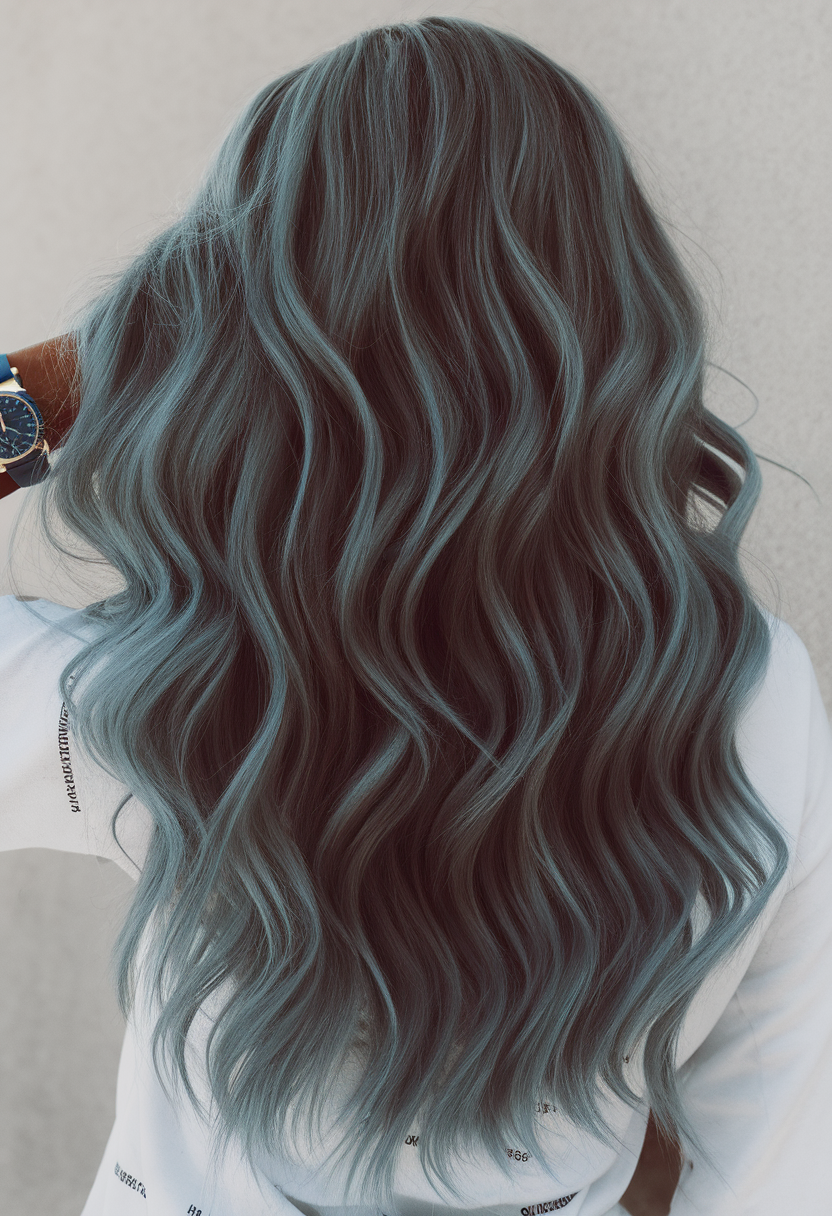 This hairstyle features striking blue waves with an icy platinum peekaboo streak framing the face. The voluminous, flowing curls add movement, making this look both playful and daring for spring hair trends. This bold color choice is ideal for Tone women who want a fresh and dynamic appearance. Perfect for those embracing unique and dyed hair colors in 2025.