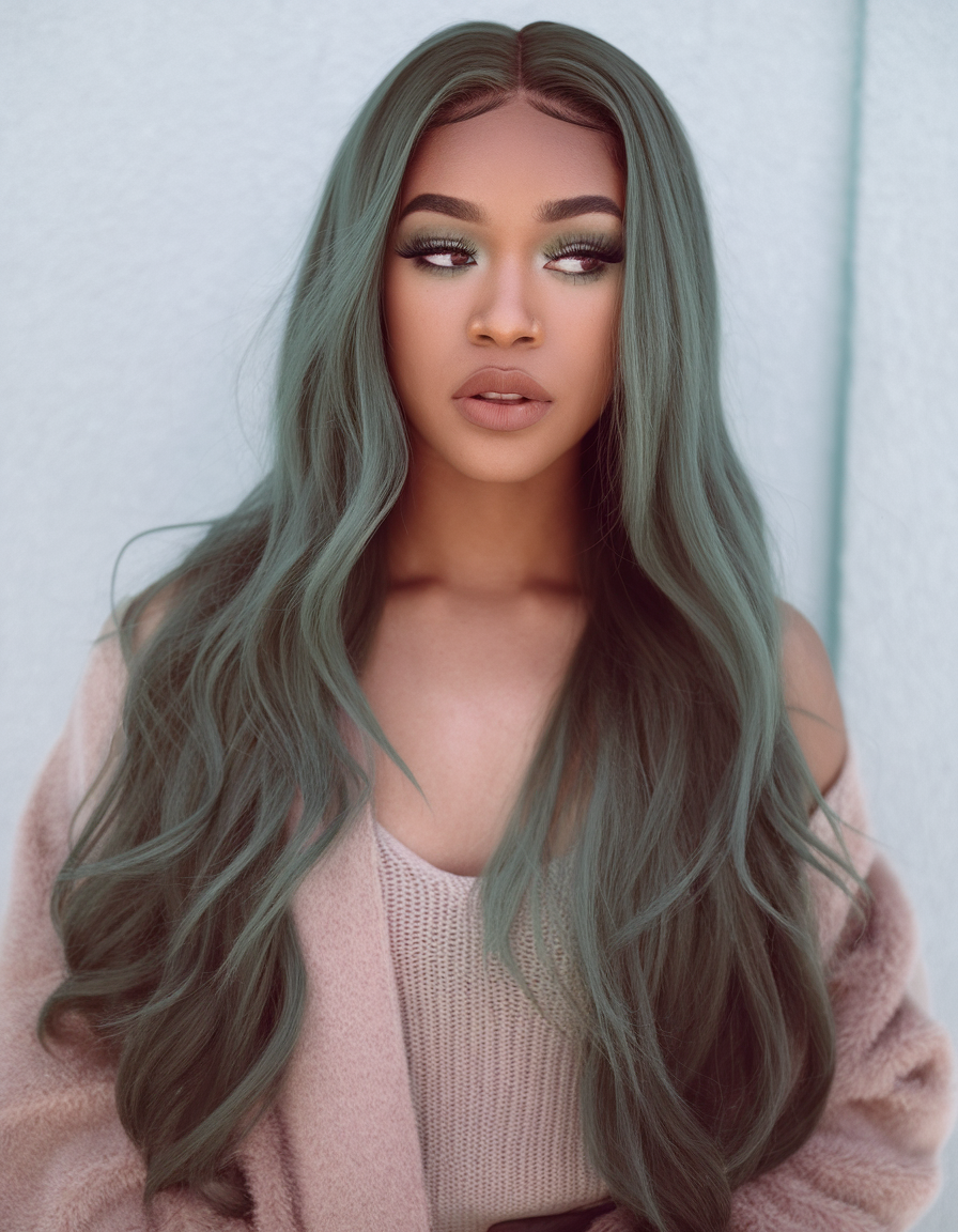This unique style highlights a soft sage green tone blended with long, flowing layers for a modern and elegant appearance. The muted green hues complement Tone women beautifully, adding a fresh and creative twist to spring hair trends. The gentle waves give this look a natural yet edgy vibe for those seeking something out of the ordinary.