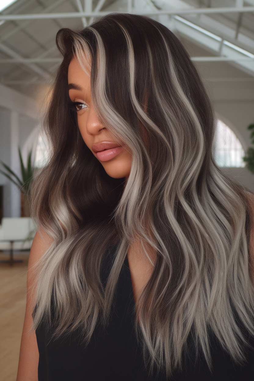 This style features a striking blend of brown and ash blonde tones, creating an elegant contrast. The subtle peekaboo highlights frame the face beautifully, adding dimension to the voluminous waves. This look is a good choice for spring hair updates, perfect for women seeking a modern yet natural appearance. The effortless waves give this hairstyle a light, breezy feel.