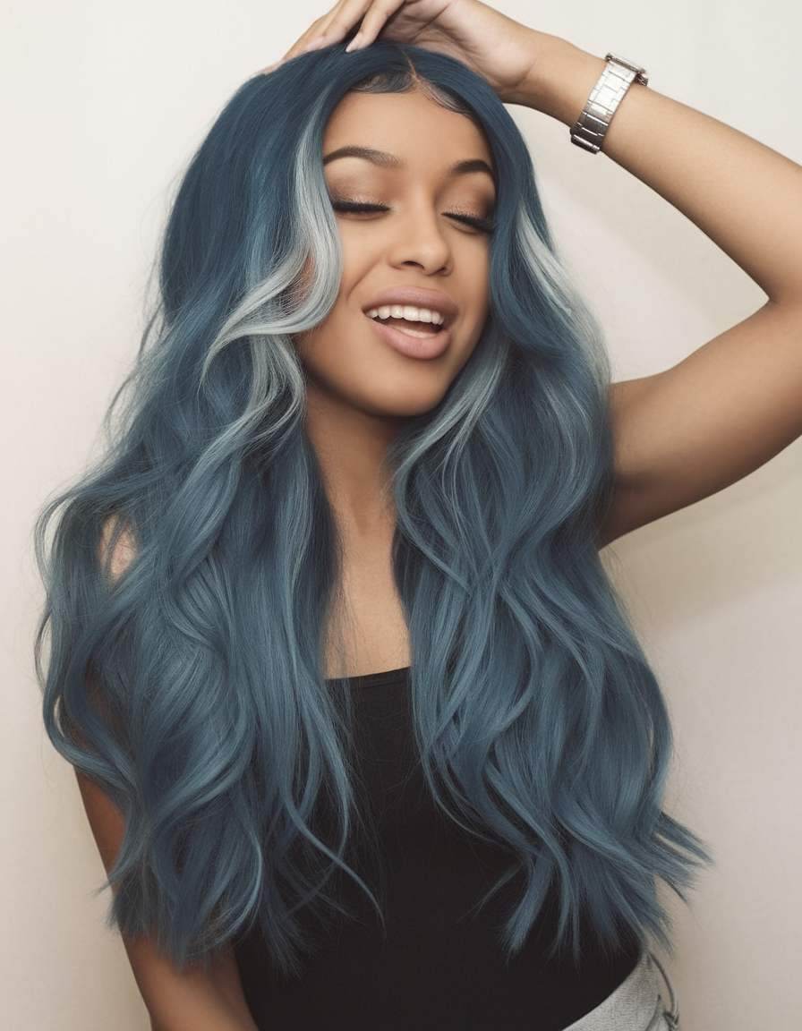 This hairstyle features vibrant blue tones flowing through long, wavy strands, creating a bold and refreshing look. The rich color adds depth and dimension, perfect for women embracing daring dyed hair trends. The loose waves enhance the playful vibe, making it ideal for spring hair color for Black women 2025 who want to stand out.