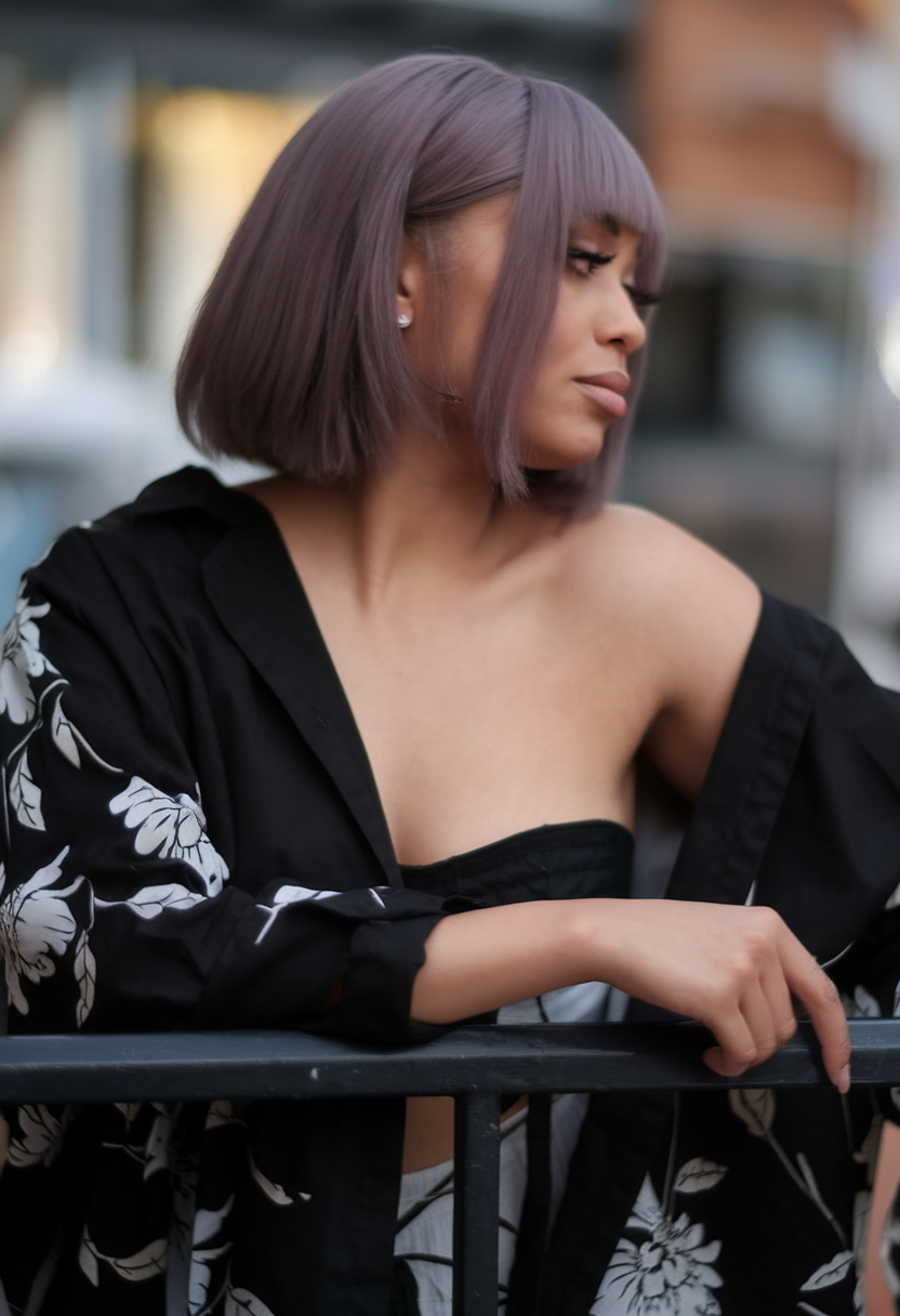 This look showcases a chic short hair cut with a sleek lavender hue. The blunt bob and sharp bangs add a polished, modern edge to the soft pastel tones. This style is ideal for women seeking a low cut and natural yet trendy color option for spring. Its clean lines and light tones are perfect for a minimalist yet bold look.