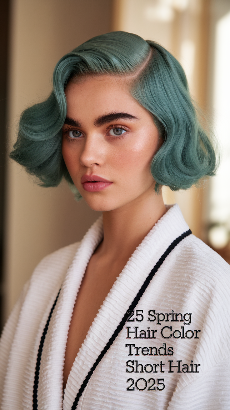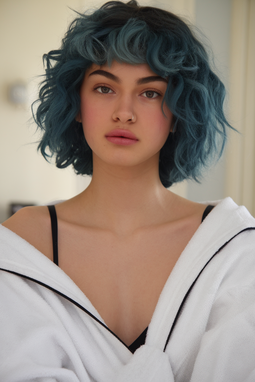 This teal wavy bob brings a playful and edgy vibe to spring 2025 trends with its rich, vibrant hue. The soft waves and full bangs add texture and frame the face beautifully. Perfect for women seeking a fun and unique hairstyle, it’s a bold choice that stands out effortlessly.