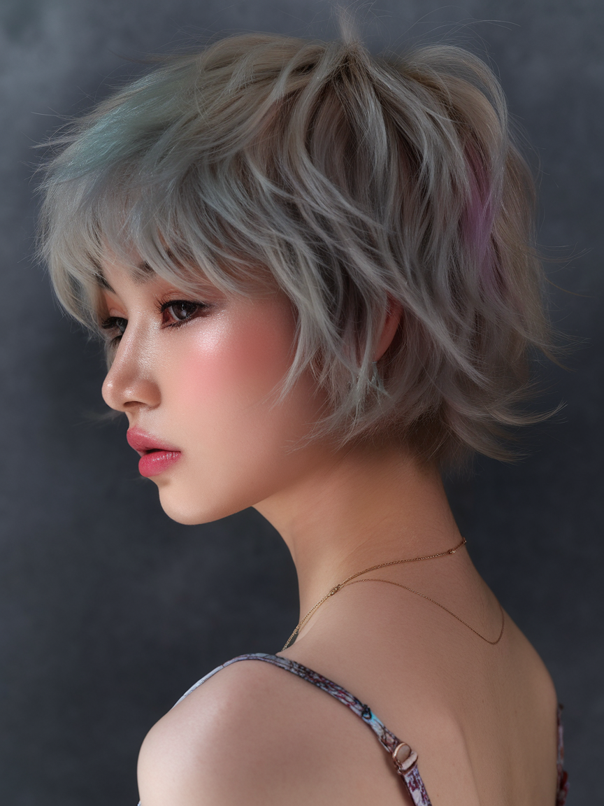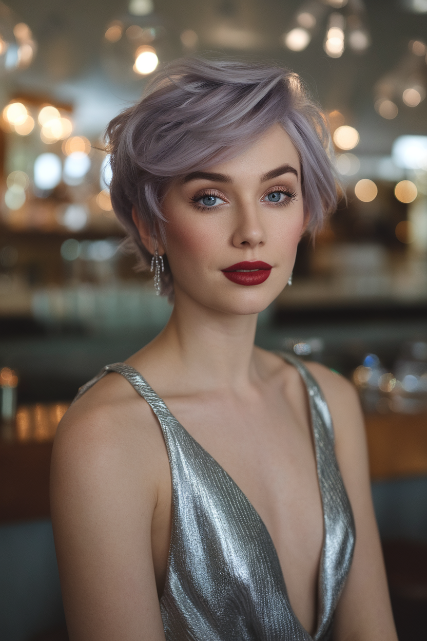 This lavender pixie combines pastel hues with soft, airy layers, making it a standout choice for spring 2025. The playful grayish-purple tones bring an elegant yet fun vibe, perfect for women who love bold and trendy looks. The layered texture enhances volume while maintaining a lightweight, effortless style.