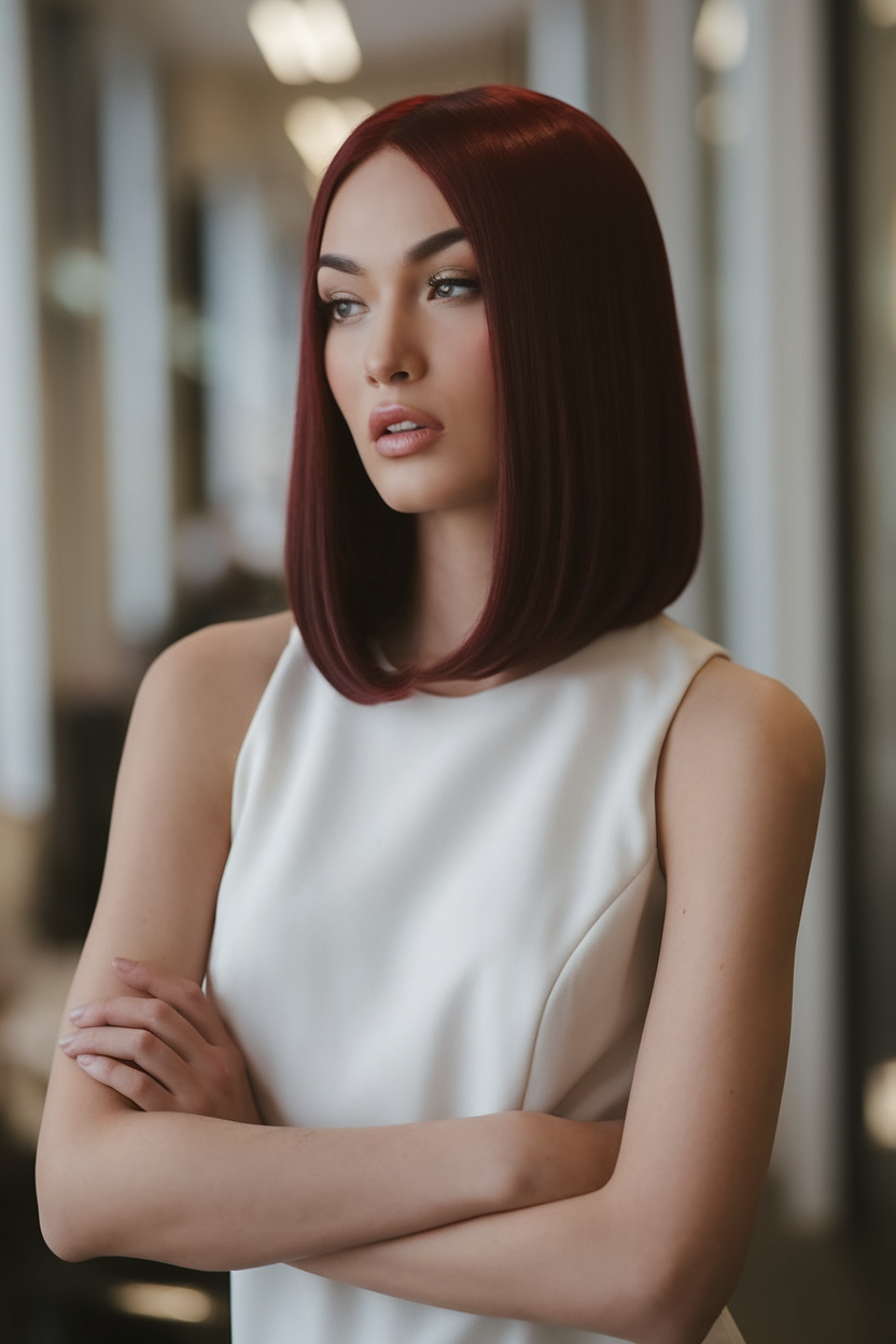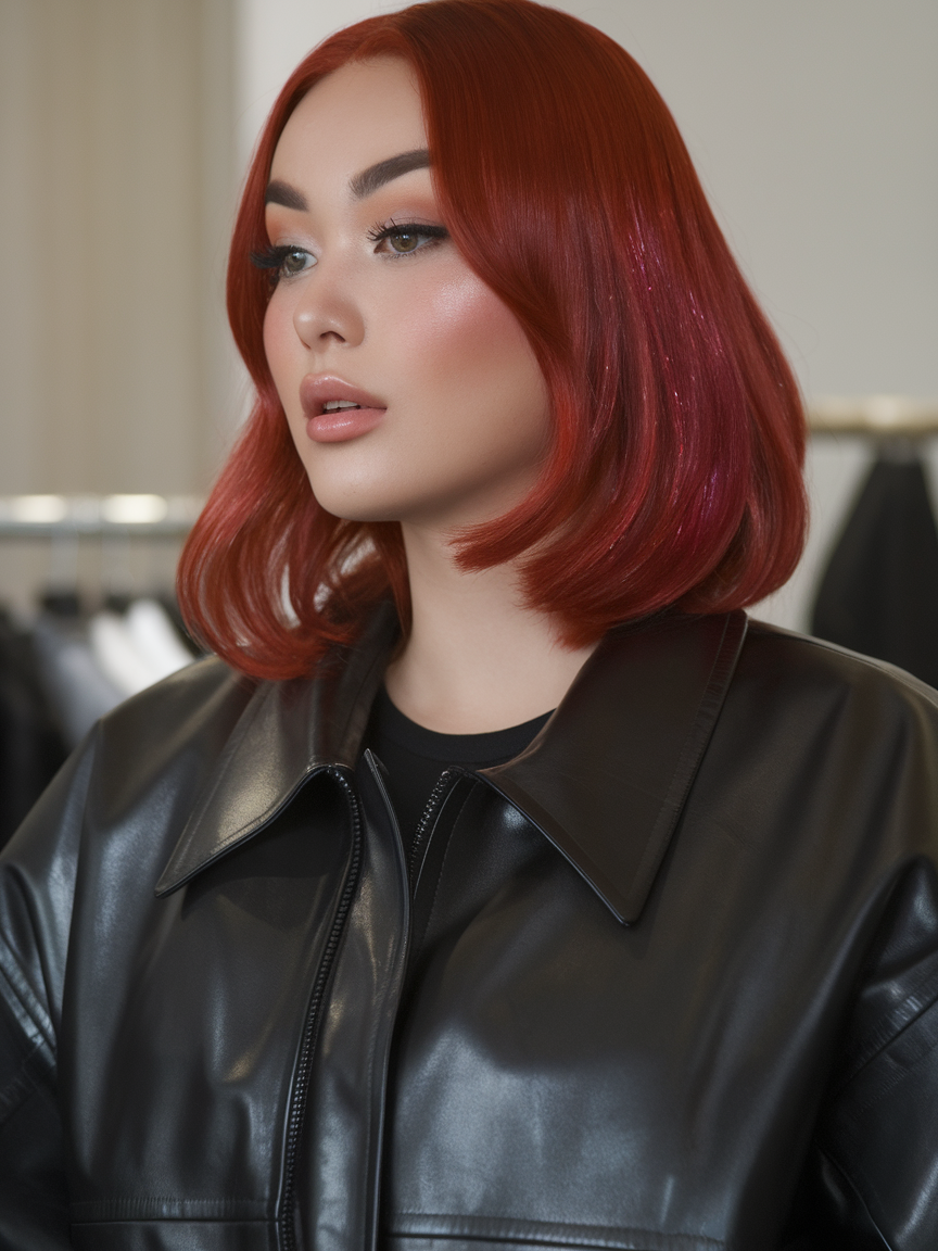 This vibrant red bob is a stunning and bold choice for spring 2025, featuring a sleek, glossy finish that enhances the fiery color. The soft, inward-curved ends add a polished and modern touch. It’s a perfect look for women seeking a standout style that combines elegance and vibrancy.