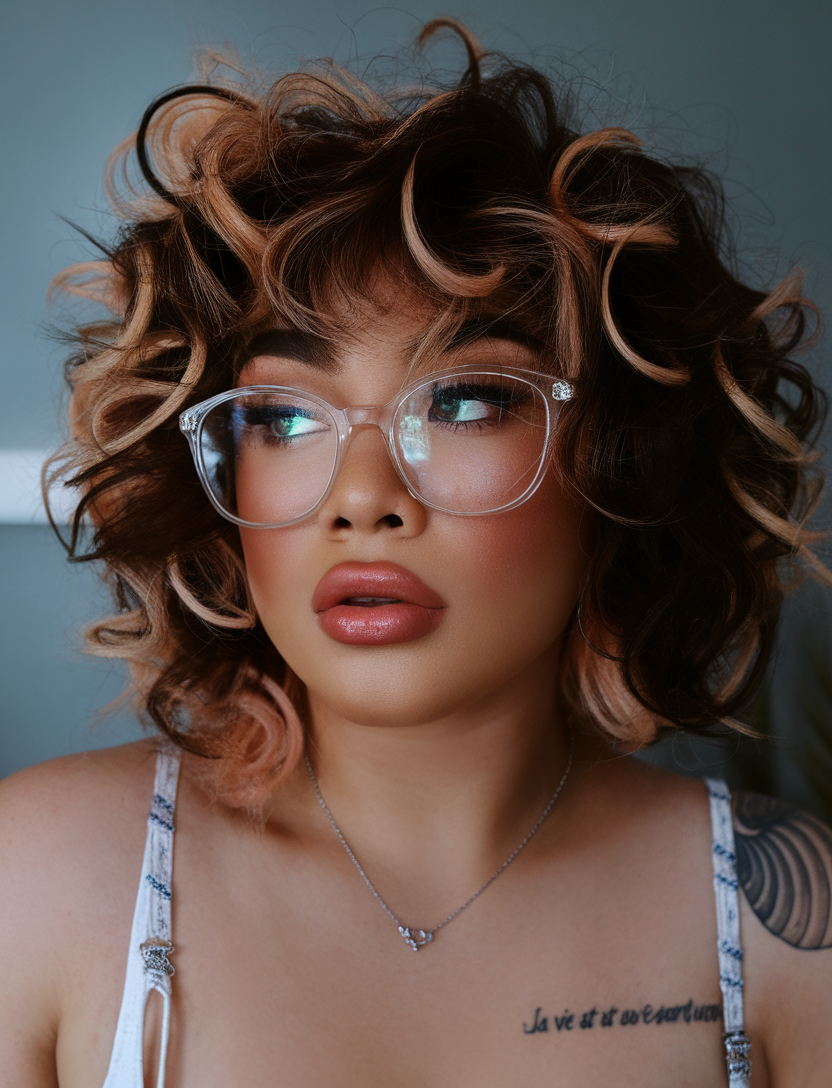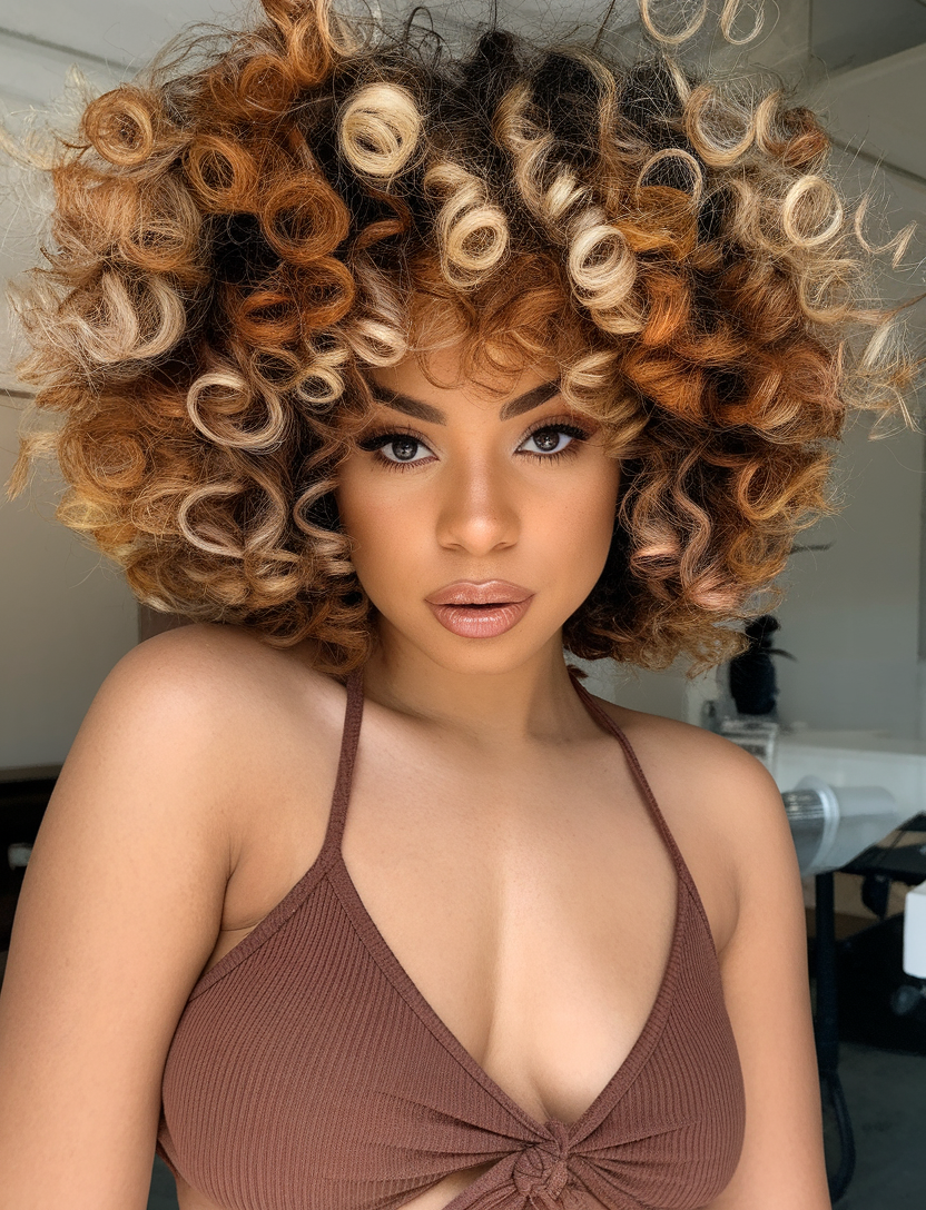 These luscious curls feature a rich chocolate cherry base blended with soft ombre tones. The voluminous style is perfect for women embracing textured hairstyles in spring 2025. It’s a fun and flattering look with hints of red and brown for added warmth.