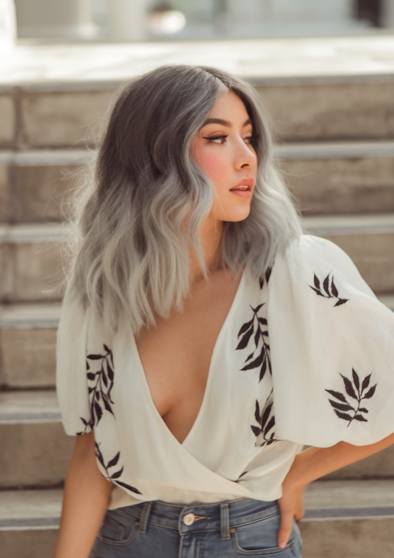This wavy ash gray hairstyle offers a sleek and sophisticated option for spring 2025. The gradient from dark roots to soft gray tips creates a striking ombre effect, adding depth and elegance. Ideal for women, it’s a trendy and versatile look that blends modern hues with classic waves.