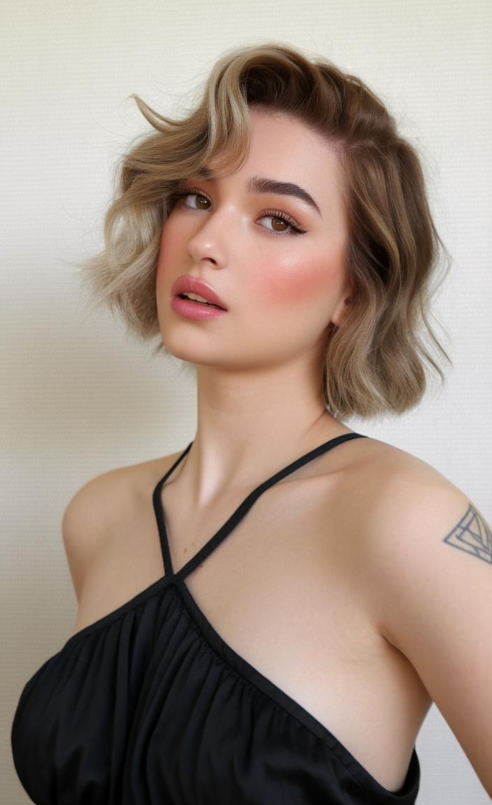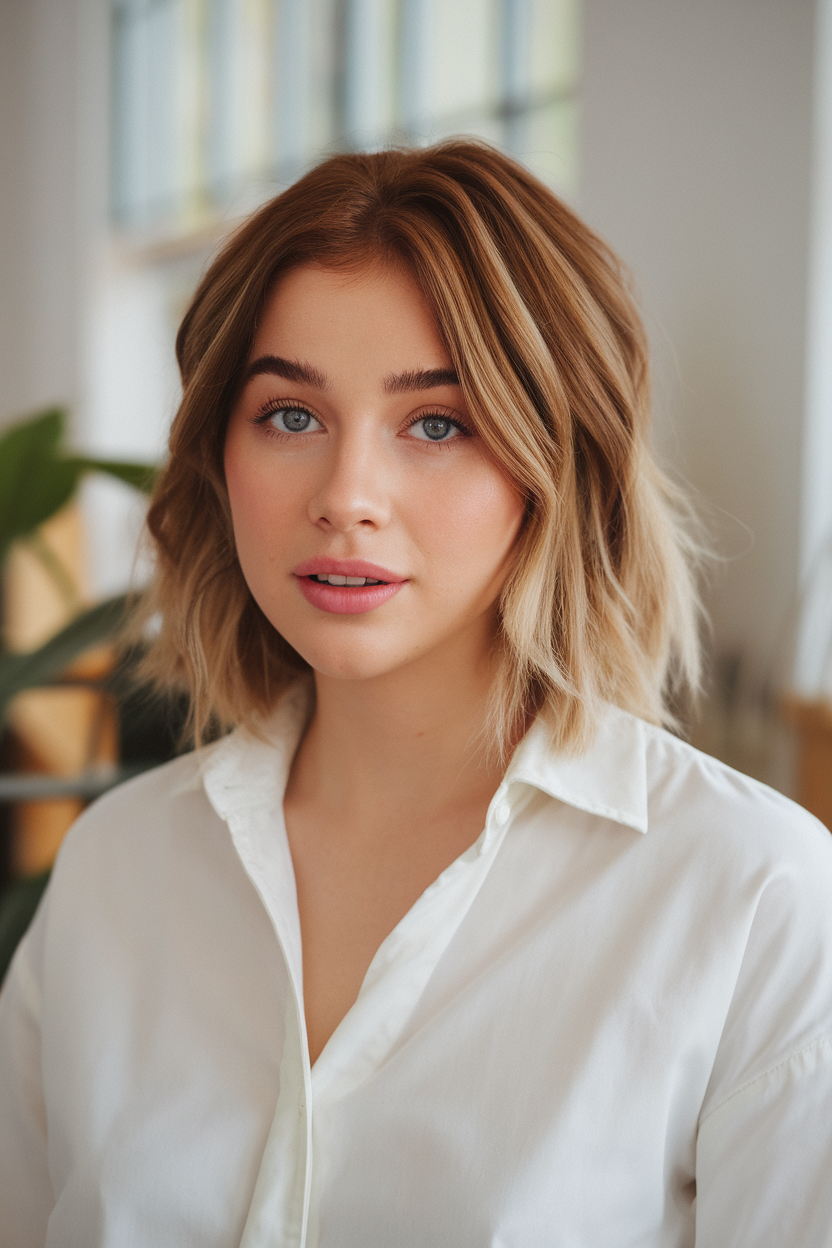 This light brown bob combines soft waves with a subtle blend of highlights for added dimension. The tousled texture enhances volume, making it a chic option for spring 2025 hairstyles. It’s a cute and versatile style for women seeking a natural and effortless vibe.