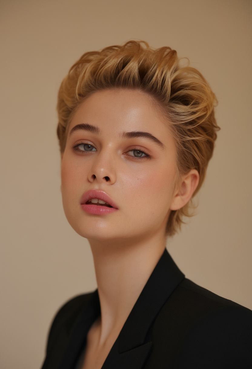A classic pixie cut is given a modern twist with sleek, brushed-back blonde locks. The subtle volume at the crown enhances the style, creating a sophisticated yet approachable vibe. This cut is ideal for those who love low-maintenance yet elegant hairstyles.