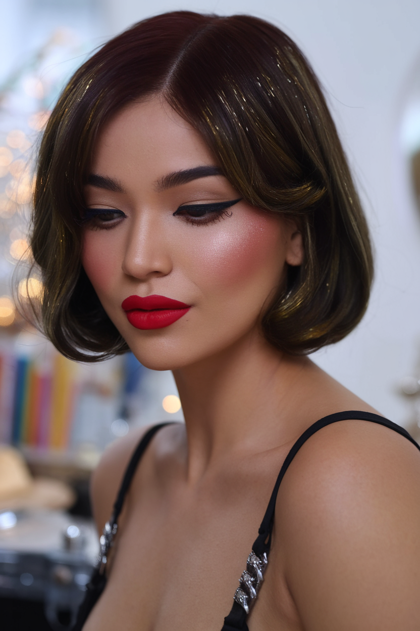 This chocolate cherry bob combines a rich, dark hue with subtle glitter highlights for a glamorous touch. The soft, inward-curving layers add depth and elegance, making it perfect for spring 2025 hairstyles. It’s an ideal choice for women seeking a bold yet sophisticated look.