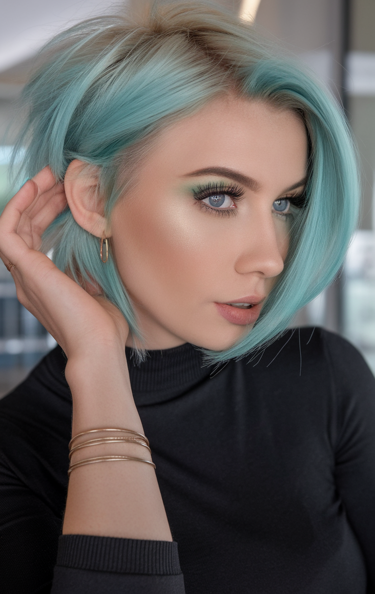This vibrant bob pairs an aqua base with light blonde highlights, making it bold and refreshing. The structured cut keeps it polished while the colors add a playful twist for spring 2025. Ideal for women seeking a trendy hairstyle, it’s both eye-catching and effortless.