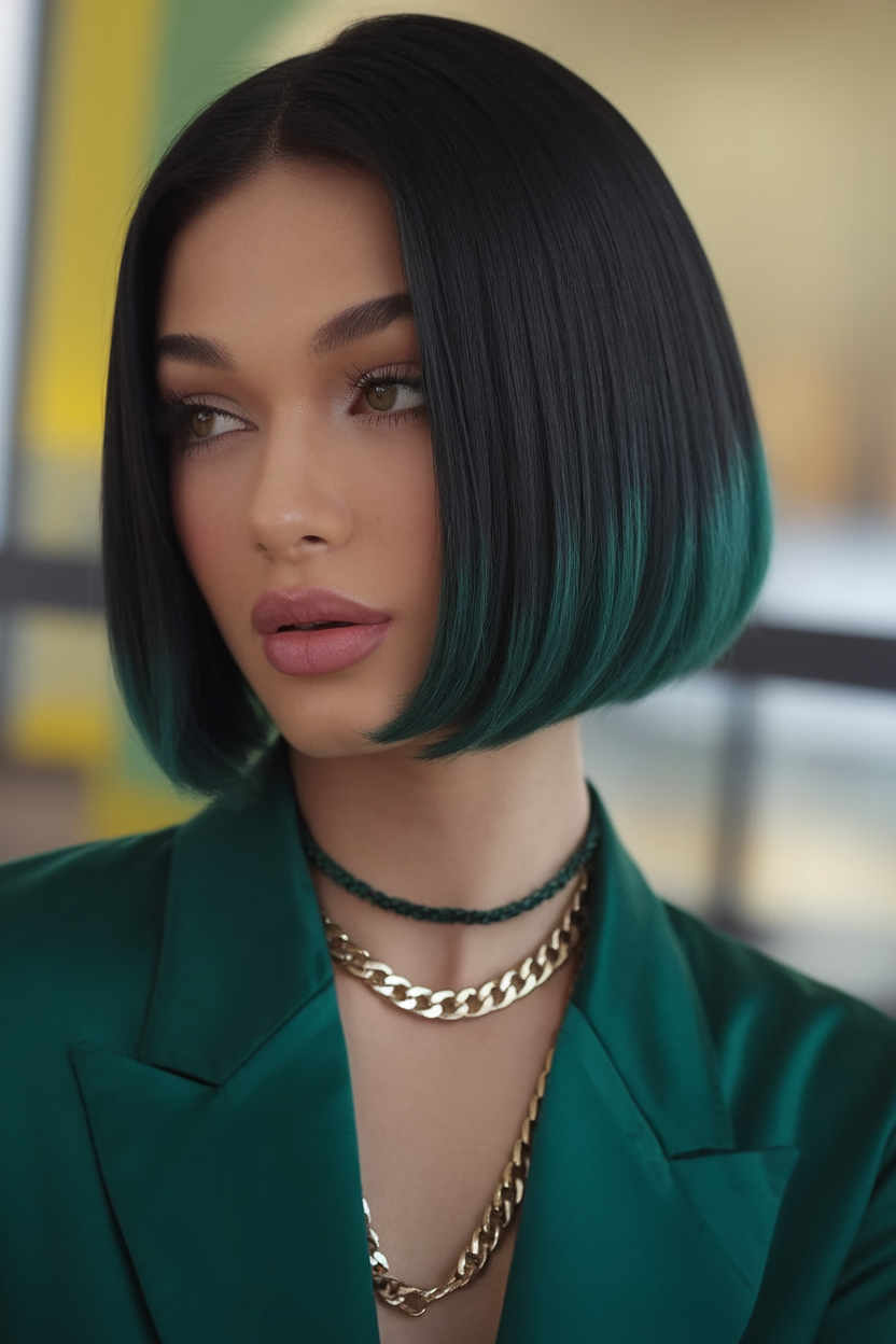 This sleek black bob features vibrant teal ends, creating a striking contrast and modern edge. The blunt cut frames the face beautifully, adding a polished and trendy touch. It’s a standout choice for women who want to embrace a bold and trendy spring 2025 style.