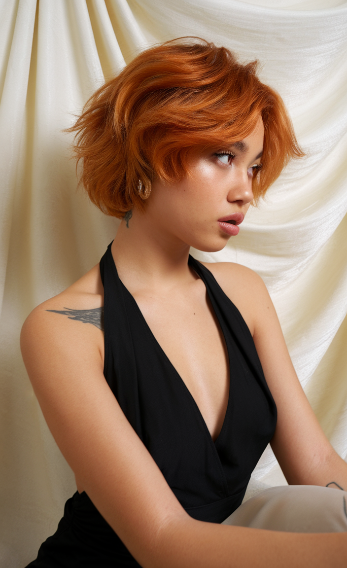 This vibrant copper-toned hairstyle is full of personality and warmth, accentuated by loose, textured waves. The layered bob adds movement while maintaining a polished finish. Ideal for anyone looking to embrace a bold, fiery look that stands out.