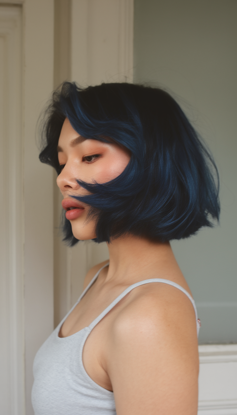 This deep blue bob with feathered ends makes a bold statement for 2025 spring hairstyles. The rich blue tone is vibrant and edgy, while the sharp, layered cut adds texture and volume. It’s a perfect option for women who want to embrace trendy ideas with a fun, colorful twist.