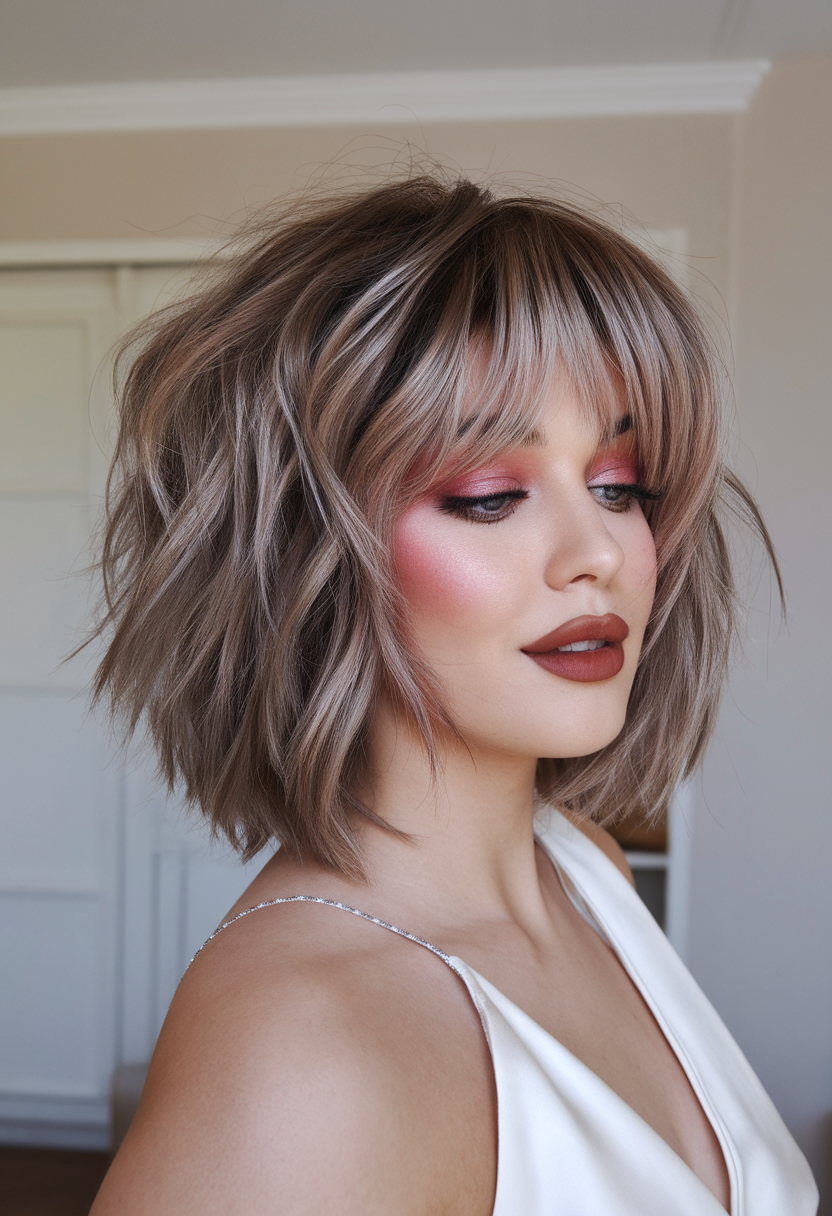 This ash brown bob is rich in dimension, featuring choppy layers and curtain bangs for a soft, tousled look. The textured cut highlights subtle variations of brown and light blonde, giving it a natural yet polished appearance. It’s a versatile and trendy hairstyle for spring 2025, ideal for adding movement to shorter hair.