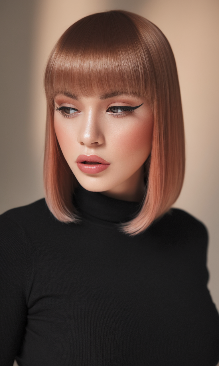 This sleek brunette bob features soft light brown undertones that add warmth and dimension. The blunt cut and smooth finish give it a polished, professional look, perfect for spring 2025 hairstyles. It’s a versatile choice that balances classic elegance with modern trends.