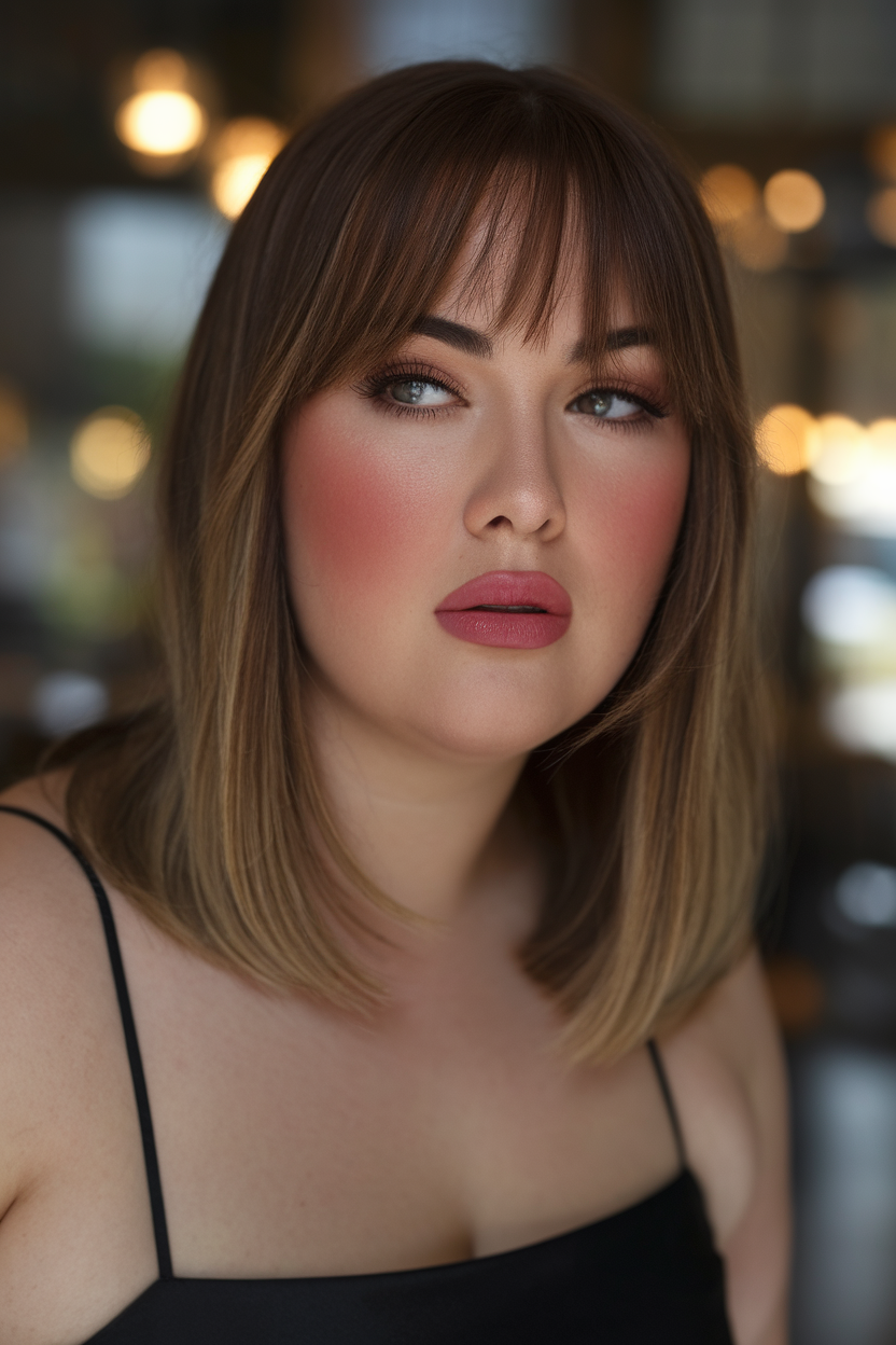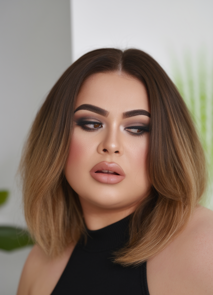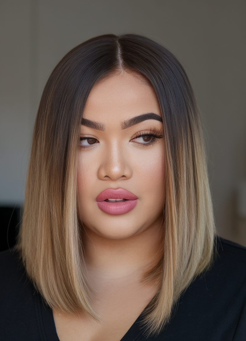 This medium-length haircut features a smooth ombre effect transitioning from dark roots to golden blonde tips. The sleek finish and middle parting help frame the face, making it ideal for spring haircuts for chubby faces 2025. It’s a versatile and elegant look for size medium women.