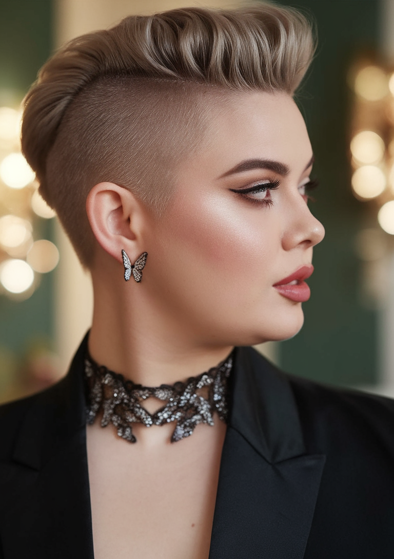 This bold undercut features closely shaved sides and a voluminous styled top. The textured blonde layers add height and structure, making it a standout choice for spring haircuts for chubby faces 2025. It’s perfect for women seeking a daring and modern look.