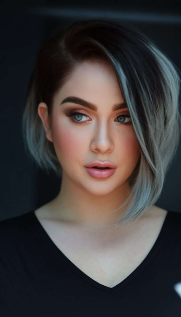 This sleek asymmetrical bob combines a dark base with striking silver highlights for a bold contrast. The angled cut frames the face beautifully, while the longer side softens the overall look. It’s a trendy option for women wanting a unique and elegant hairstyle.