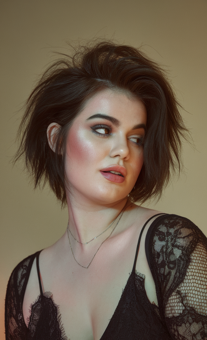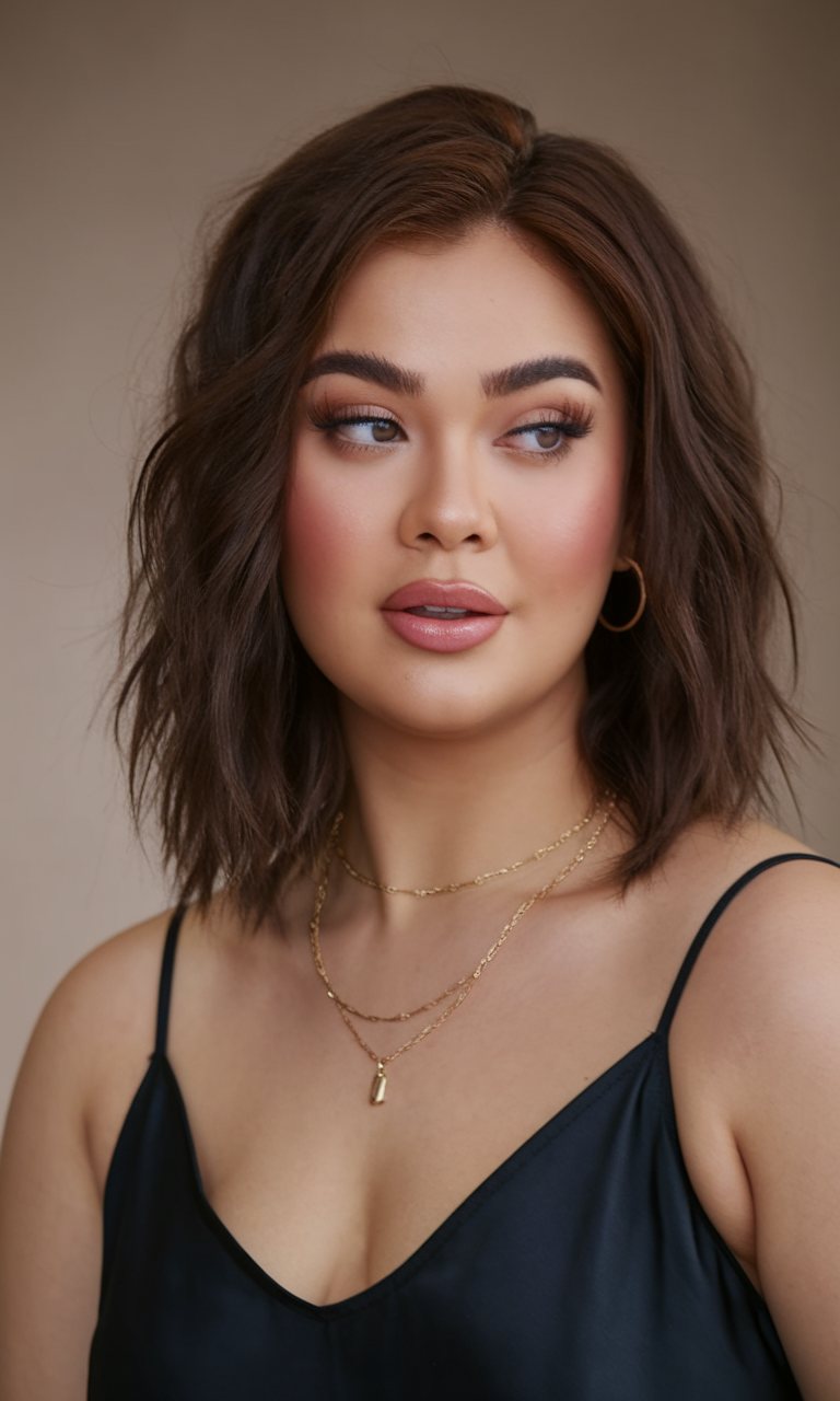 This short bob features side-swept layers that add volume and movement. The tousled texture enhances the casual yet stylish vibe, perfect for spring haircuts for chubby faces. The warm brown shade complements the overall look, making it both trendy and versatile.