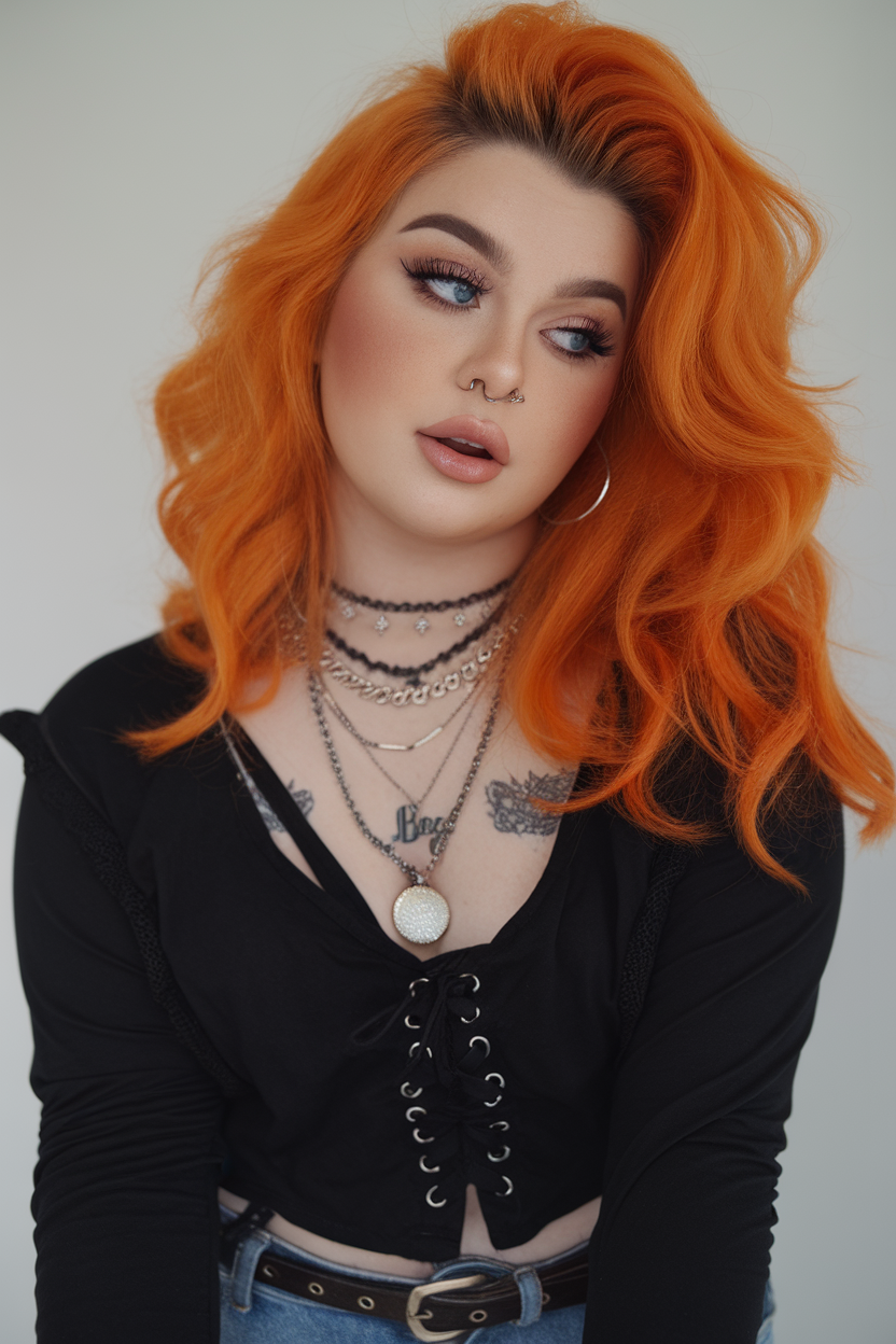 This fiery orange hairstyle is full of bold, voluminous waves that radiate confidence. The layered texture and side-swept style add dimension and movement, making it perfect for spring. It’s a striking choice for women looking to stand out with a playful yet stylish cut.
