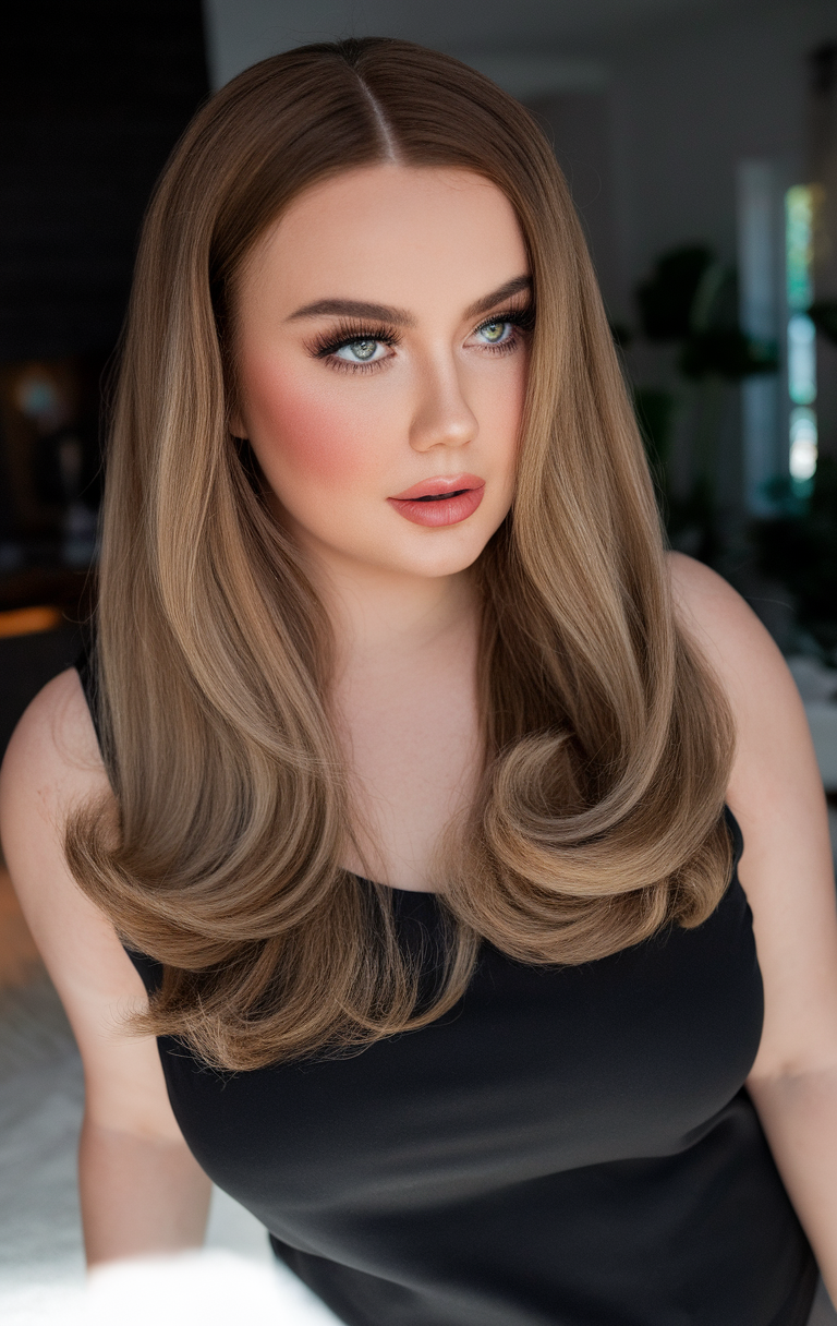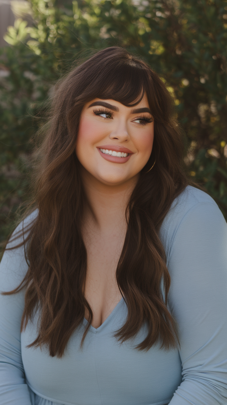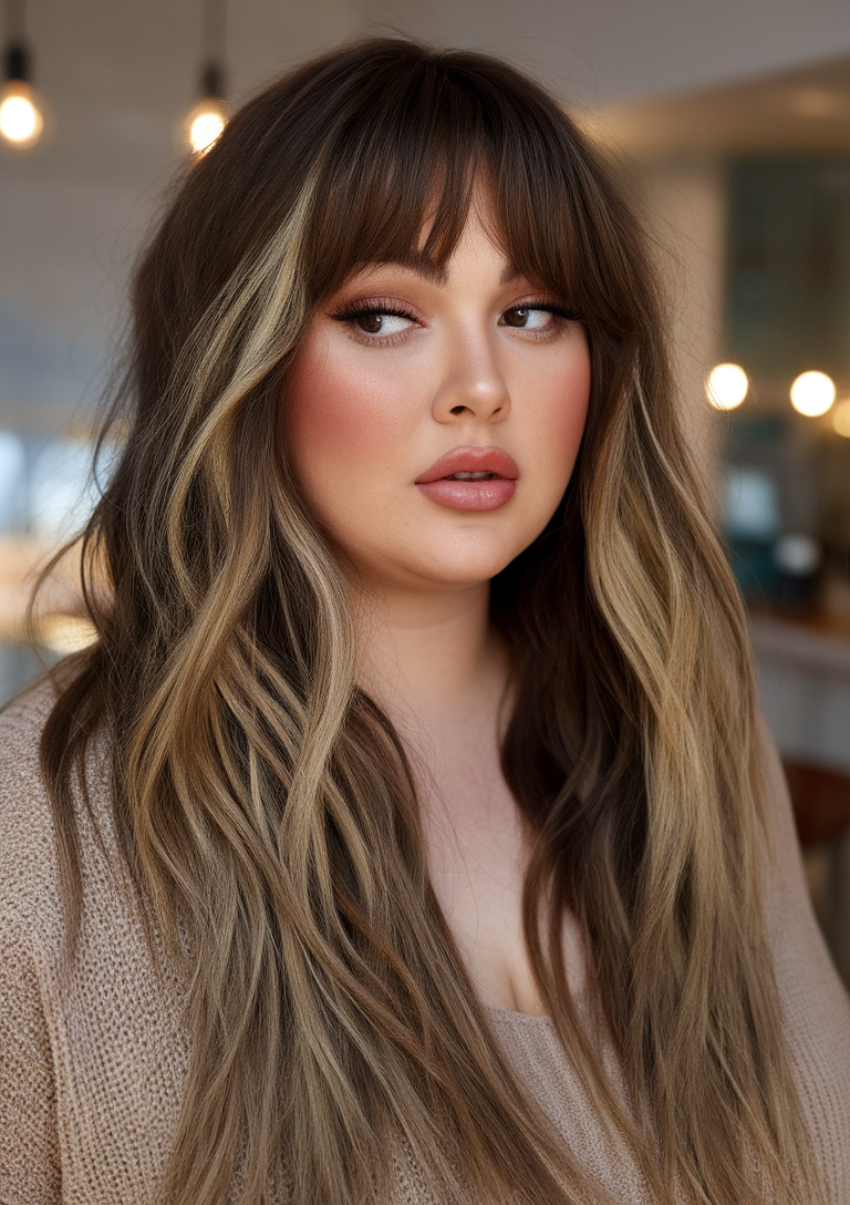 This hairstyle features long, wavy layers with soft bangs that frame the face beautifully. The subtle highlights add dimension, making it one of the best spring haircuts for chubby faces 2025. It’s a great choice for women looking for a voluminous yet natural look.