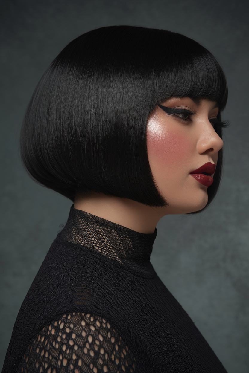 This sleek blunt bob in jet black showcases a sharp, polished cut paired with thick bangs. The structured style frames the face beautifully, emphasizing clean lines and a modern aesthetic. It’s a bold and sophisticated choice for women seeking a striking spring haircut.