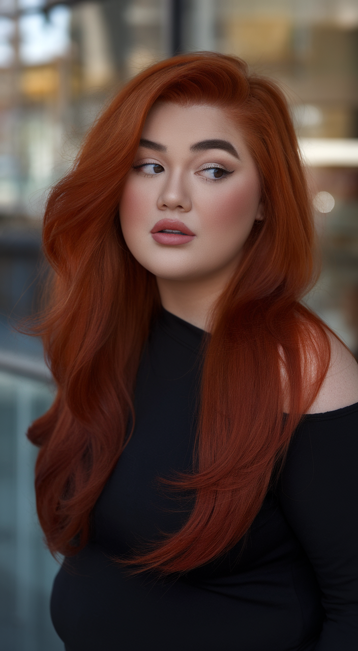 This fiery red hairstyle boasts long, voluminous layers that create a dynamic and bold appearance. The cascading waves add movement and enhance the vibrant hue, making it ideal for women looking to stand out. It’s a confident and stunning option for spring haircuts.