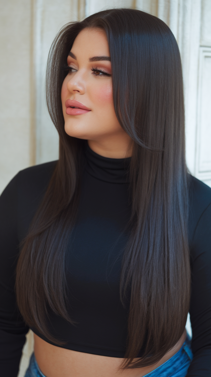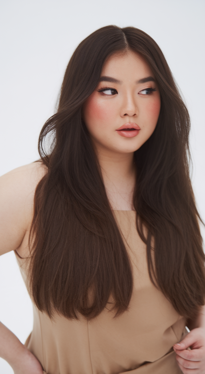 This long, sleek hairstyle is polished and elegant, with a center part that emphasizes facial symmetry. The smooth texture and straight ends elongate the face, making it ideal for women with a rounder shape. It’s a timeless option for those seeking long, flowing styles for the season.