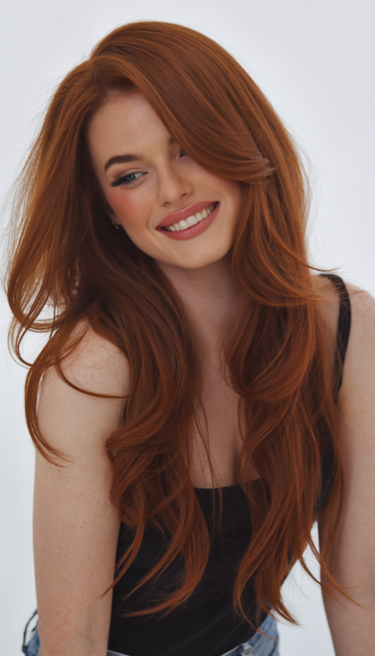 This style features soft, flowing layers that emphasize the vibrant auburn hair color. The face-framing strands add dimension and balance, making it perfect for an oval face. It’s a beautiful and trendy option for those wanting a standout look this spring.