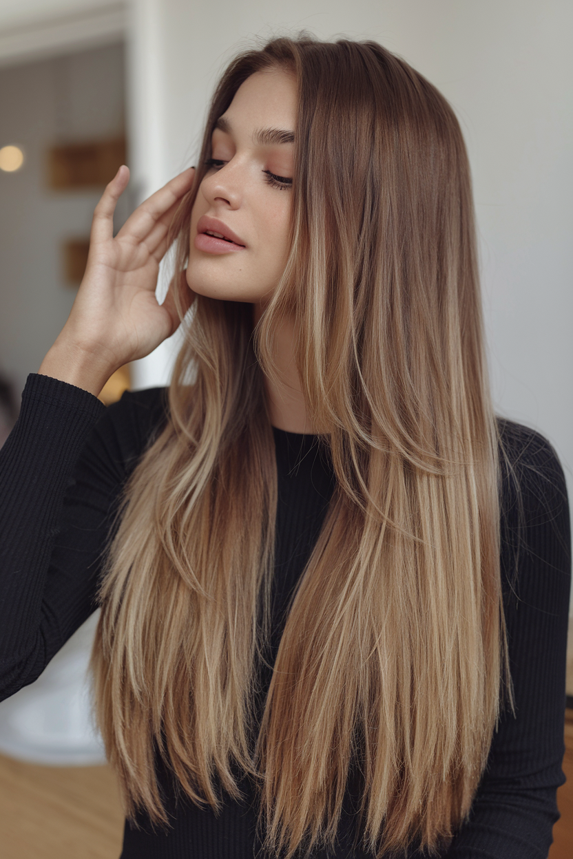 Long, straight layers with an ombre effect make this hairstyle effortlessly polished. The smooth gradient from dark to light tones creates a simple, elegant look. Perfect for those seeking a trending style with minimal maintenance.