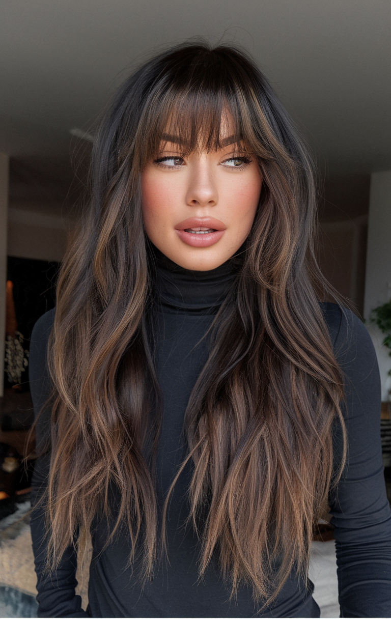 This haircut combines soft bangs with light layers, creating a balanced look for an oval face. The layers add subtle movement, while the bangs gently frame the face. It’s a simple and pretty style that’s perfect for spring haircuts for long hair.