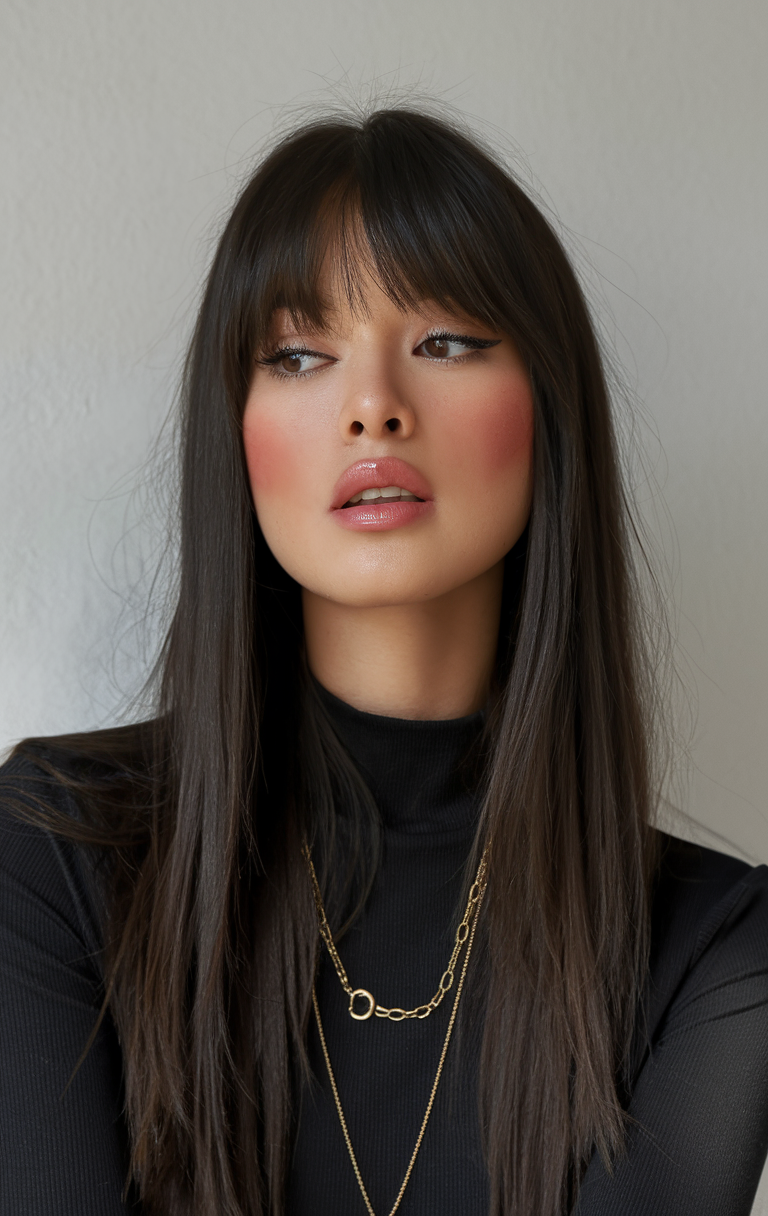 This look features long, straight layers paired with soft, wispy bangs for a polished and chic finish. The rich brunette color enhances the sleekness, making it both trendy and timeless. Perfect for those who want a simple yet elevated hairstyle.