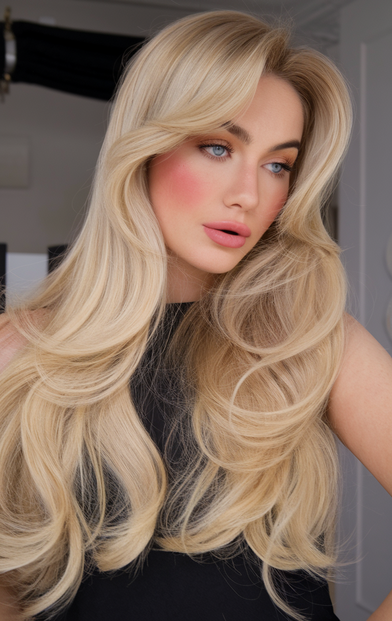 Soft layers cascade into voluminous waves, complemented by elegant curtain bangs. The bright blonde tone adds vibrancy, while the layered cut provides texture and movement. A beautiful option for those seeking a unique, airy style.