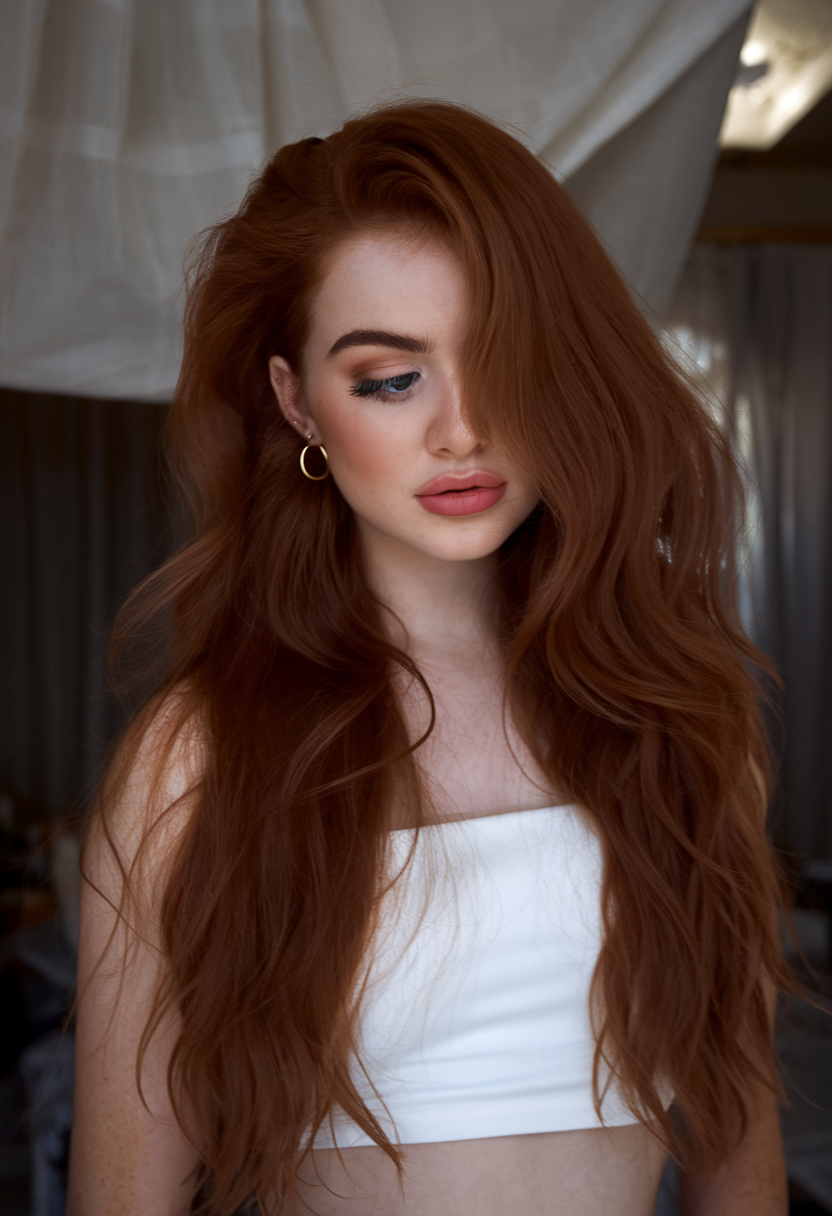 This style showcases flowing auburn waves that exude warmth and dimension. The soft, layered texture enhances the volume and adds a romantic feel. Ideal for anyone looking for a pretty and effortless spring hairstyle.