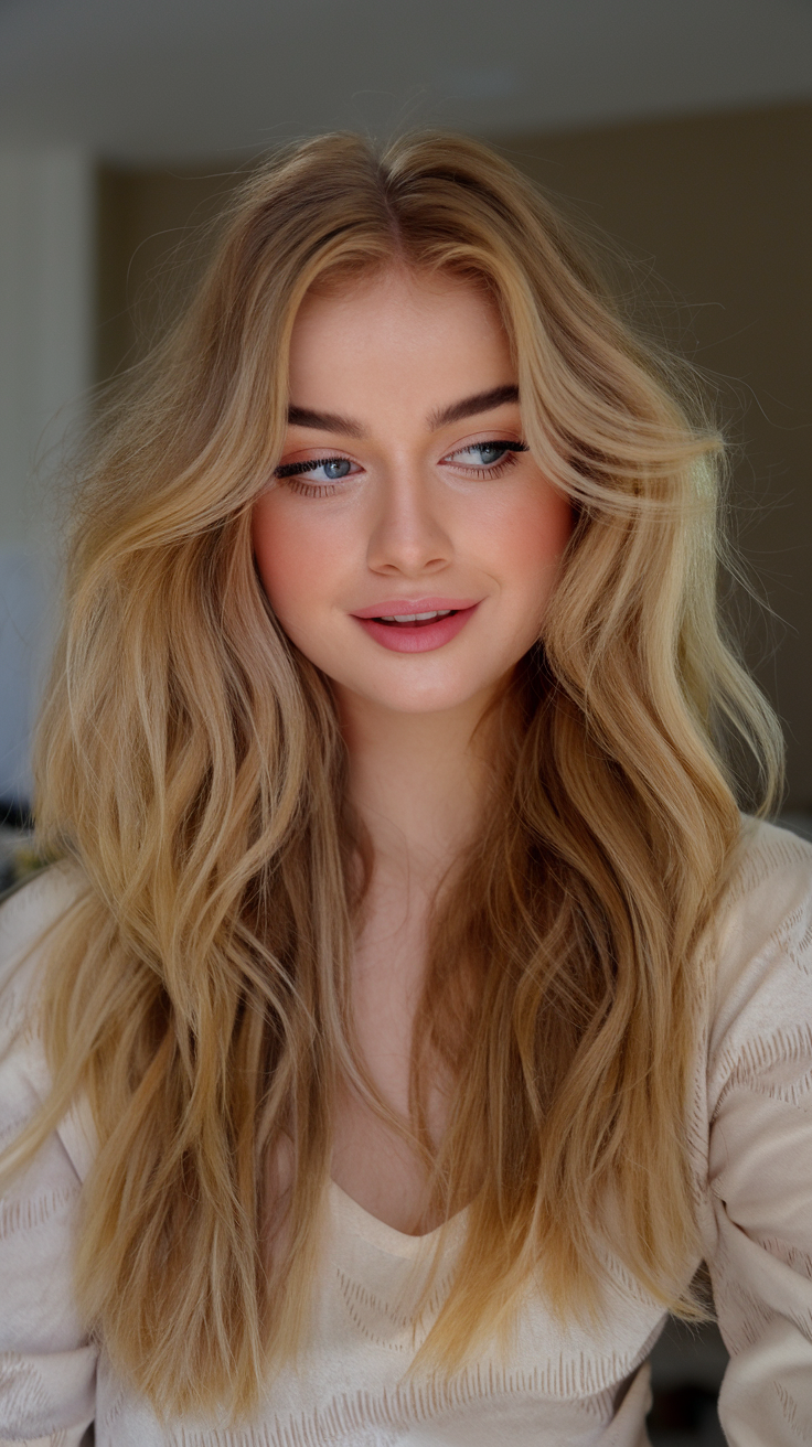 This style features loose, tousled layers that exude effortless charm, with a soft golden-blonde hue that enhances the warmth of the look. The wavy layers frame the face naturally, adding texture and dimension. Perfect for those seeking a trendy and natural hairstyle, it suits women aiming for a laid-back yet elegant spring look.