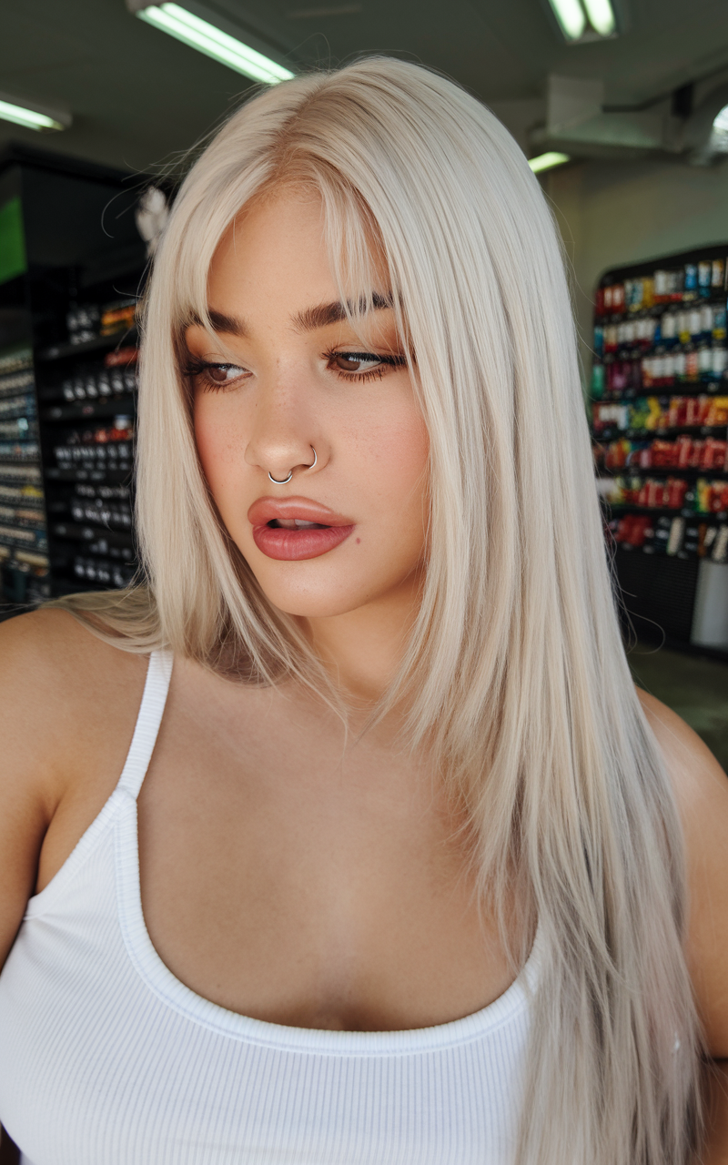 This sleek, straight style highlights a platinum-blonde color, creating a bold and edgy aesthetic. The precision cut with long face-framing layers ensures a polished and modern look. A perfect choice for women seeking a unique and fashion-forward style, this hairstyle is effortlessly chic and strikingly beautiful.