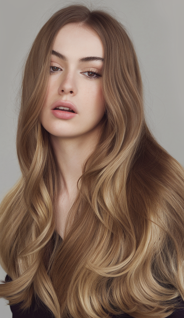 This look showcases soft, cascading waves in a warm light brown shade with subtle highlights that add dimension and brightness. The gentle waves provide a natural yet polished finish, ideal for framing the face. This hairstyle is perfect for adding movement and volume to fine or medium hair.