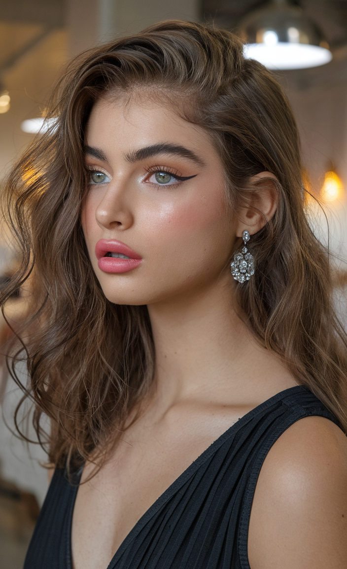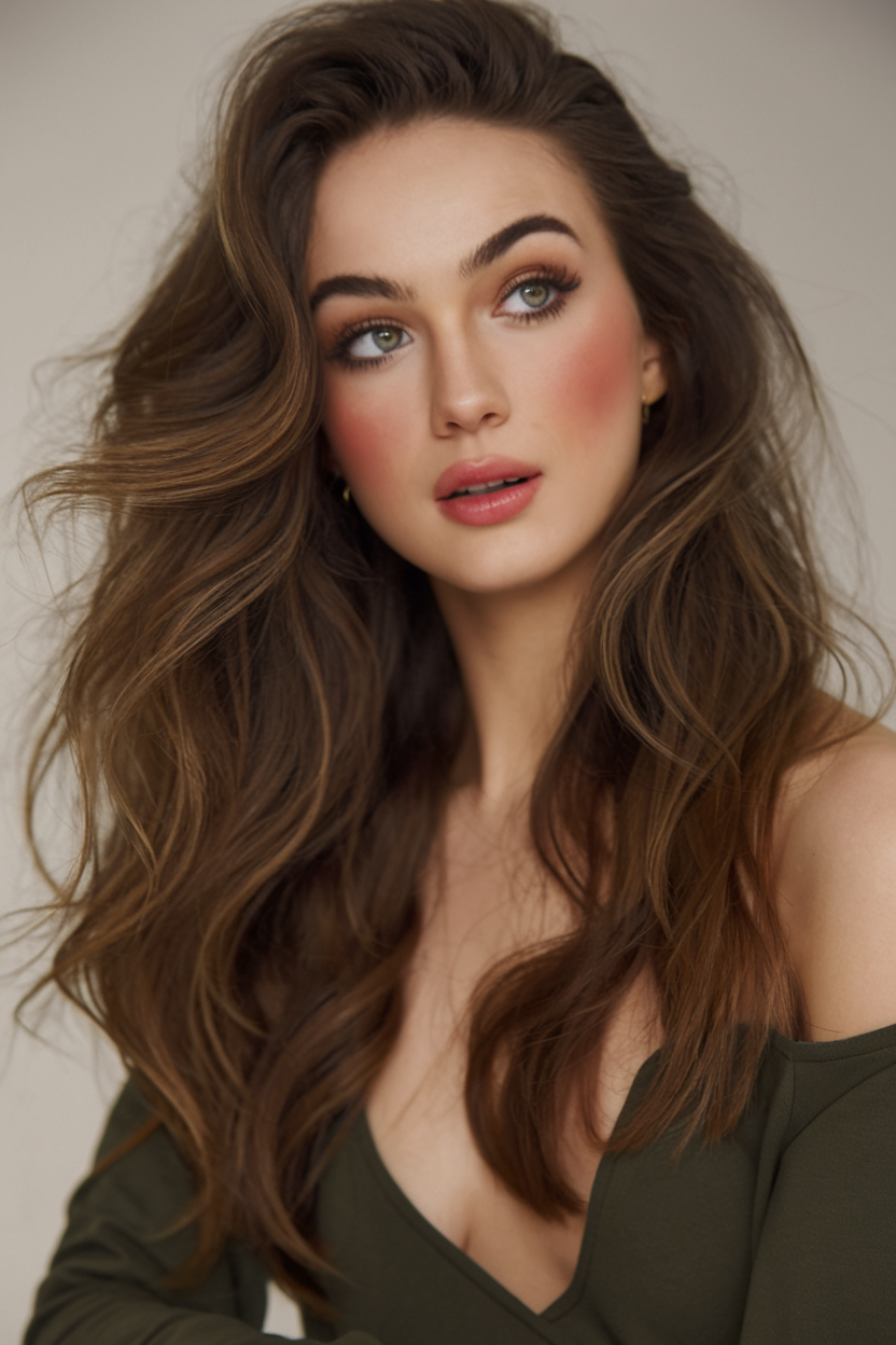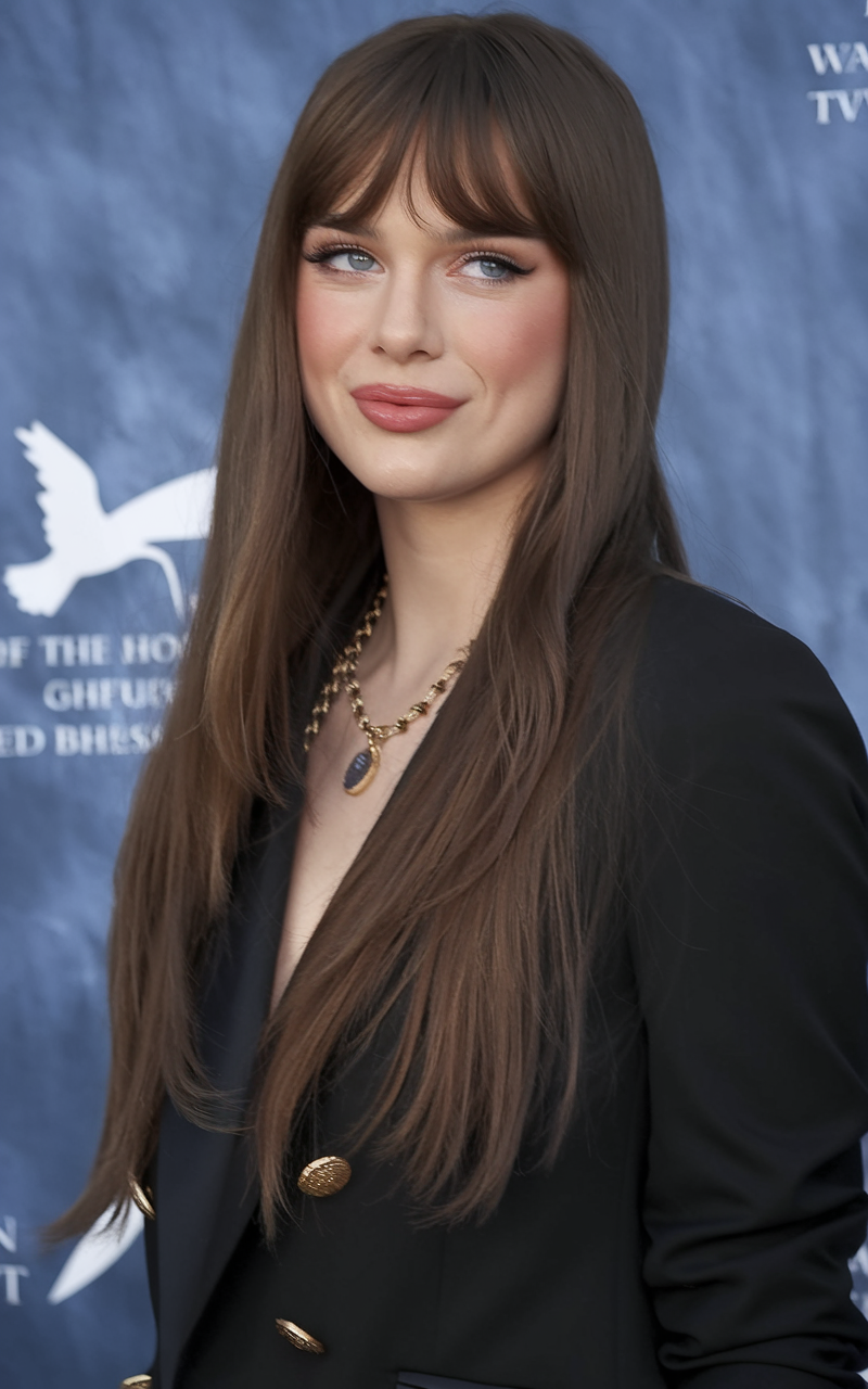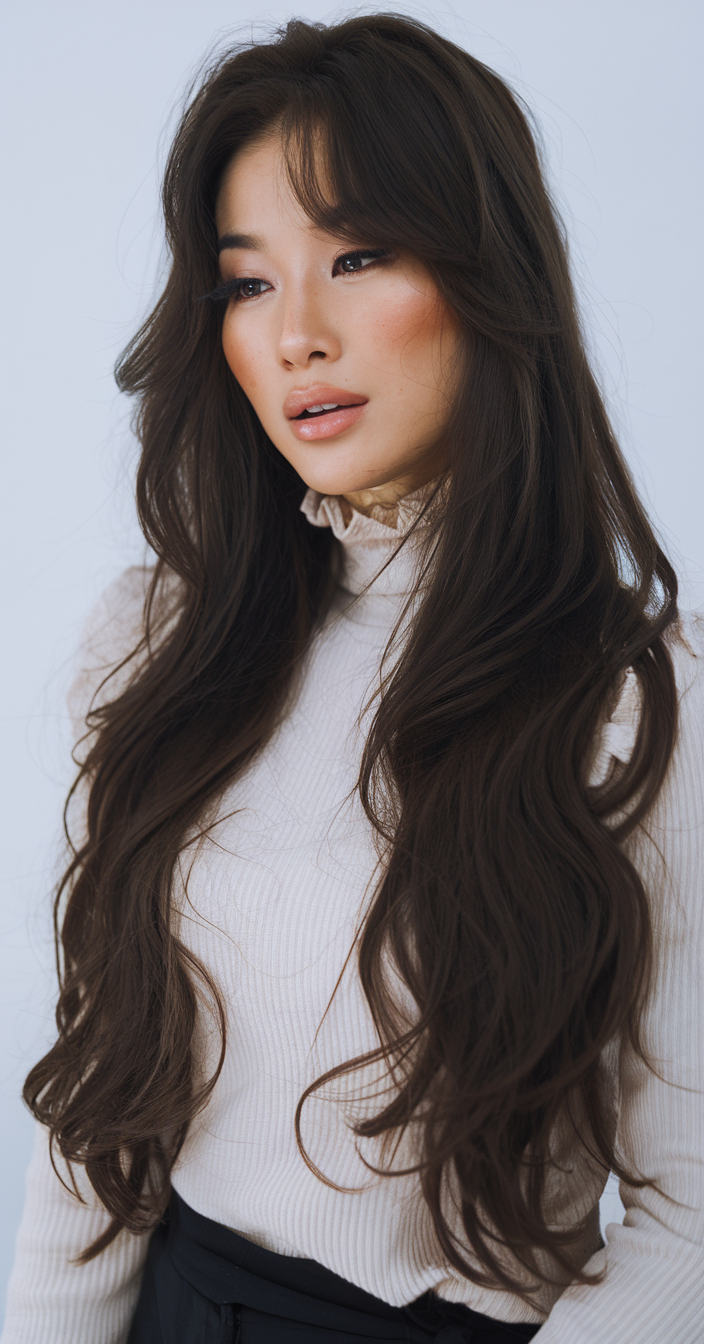 The deep chestnut brown hair cascades into soft, layered waves that frame the face with a romantic touch. The voluminous, feathered layers add dimension, creating a look that’s both timeless and effortlessly chic. The subtle curtain bangs enhance the natural flow of the hairstyle, making it ideal for both casual and formal settings.