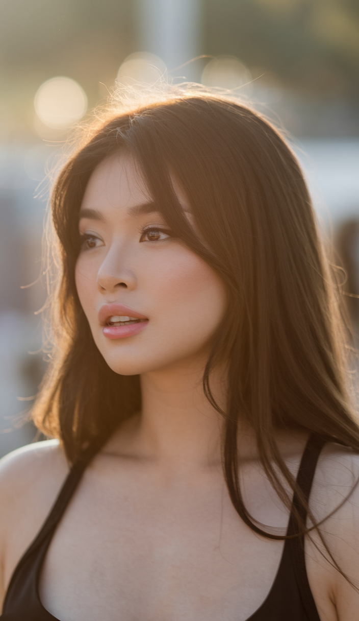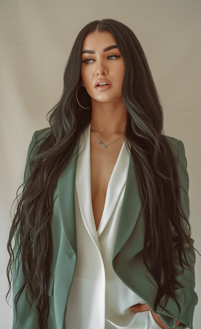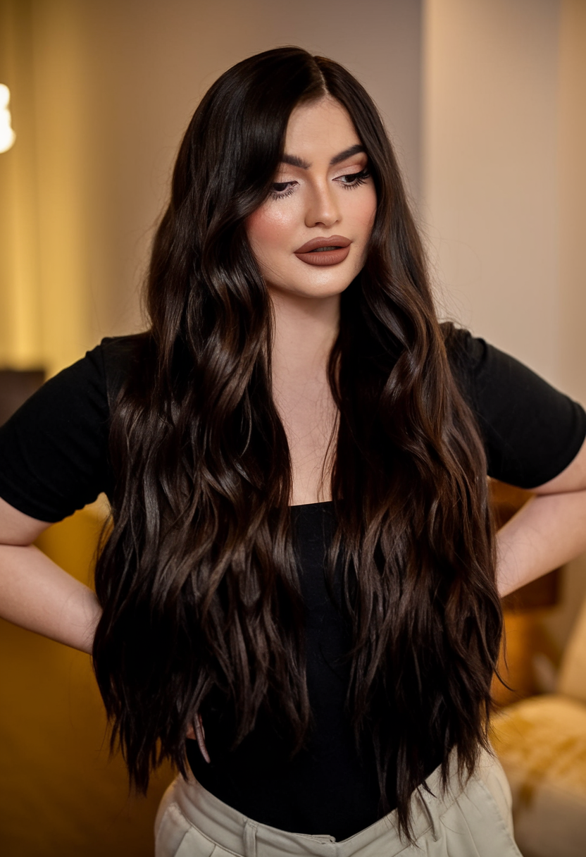 This sleek, straight style highlights the beauty of deep jet-black hair, accentuated by its extraordinary shine and length. The strands are meticulously smooth, creating a sophisticated and timeless appeal. This look is ideal for those who want a dramatic, polished style.