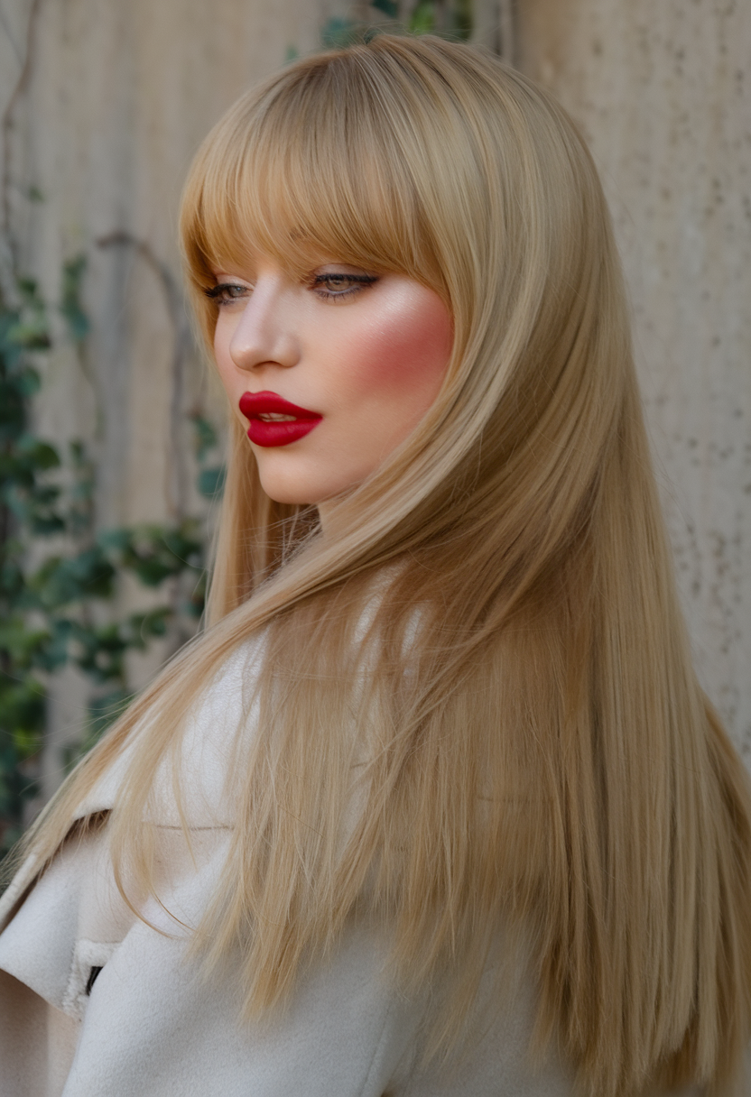 This style showcases flawlessly straight blonde hair with a silky, smooth texture. The soft, golden tones throughout create a luminous effect, while the wispy, face-framing bangs add a playful yet polished vibe. The overall sleekness of the hair emphasizes its healthy shine and perfect cut.