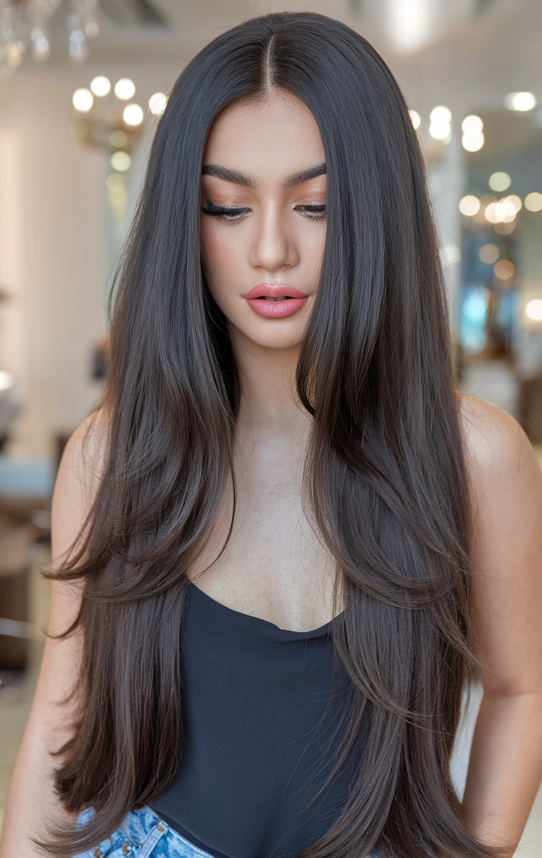 Long, sleek layers straight with face-framing sections create a polished and beautiful look. The smooth texture emphasizes the natural shine of the hair, while the subtle layers add depth. This style is ideal for achieving a trending, unique cut for women seeking minimal yet striking details.
