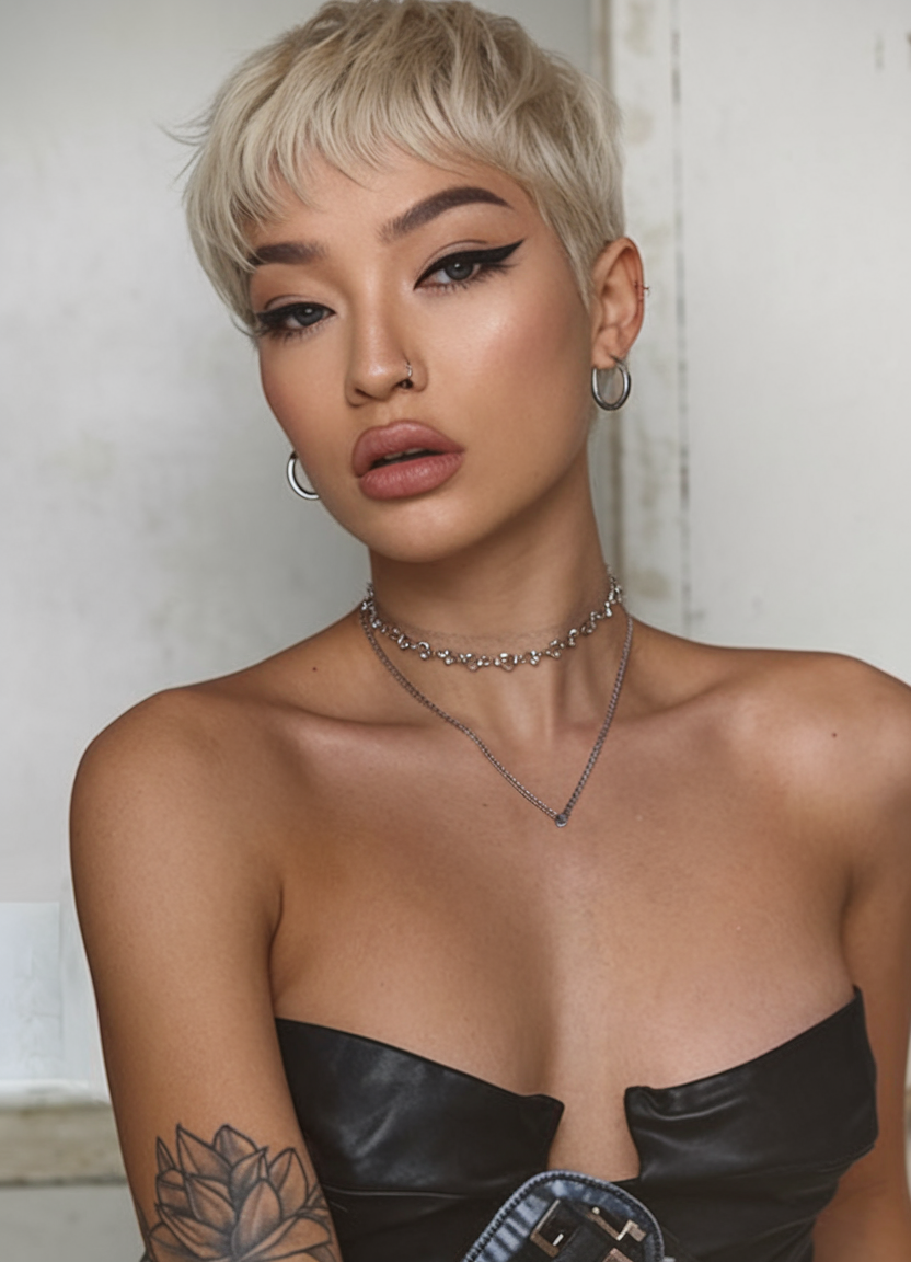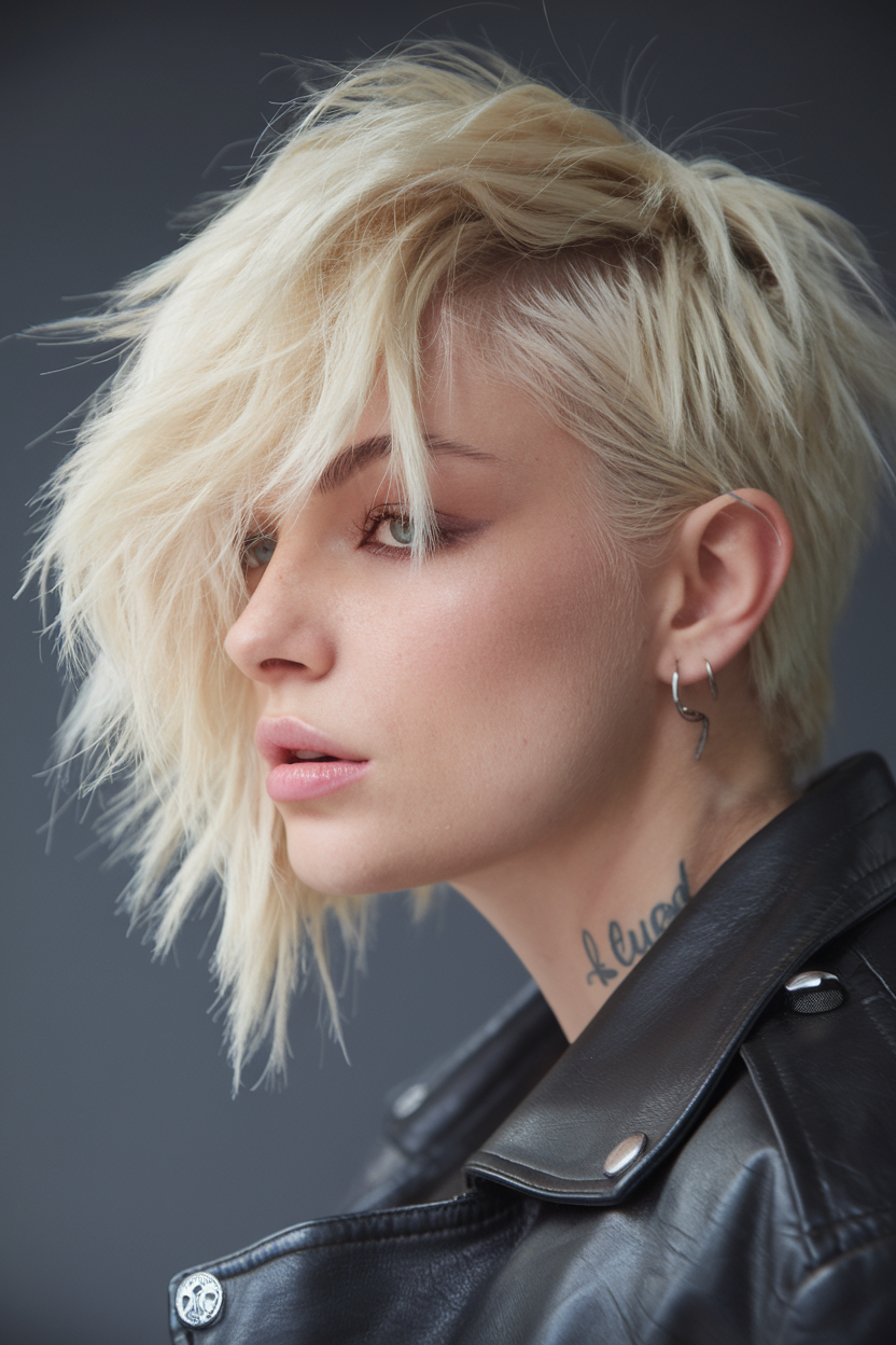 This bold asymmetrical pixie cut combines textured layers with a striking side-swept fringe for an edgy, modern vibe. The platinum blonde shade enhances the dramatic appeal of the style, making it a standout choice for women who love adventurous looks. Perfect for creating a trendy, high-impact aesthetic, this cut is ideal for spring makeovers.