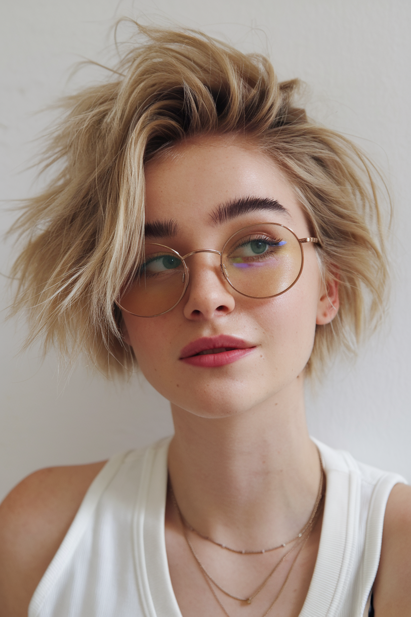 This textured short haircut features soft layers that add volume and movement to the style. The subtle fringe frames the face perfectly, making it ideal for a casual yet polished look. The warm, light brown hue enhances the natural flow of the layers, creating a trendy and youthful appearance.