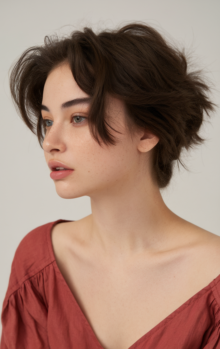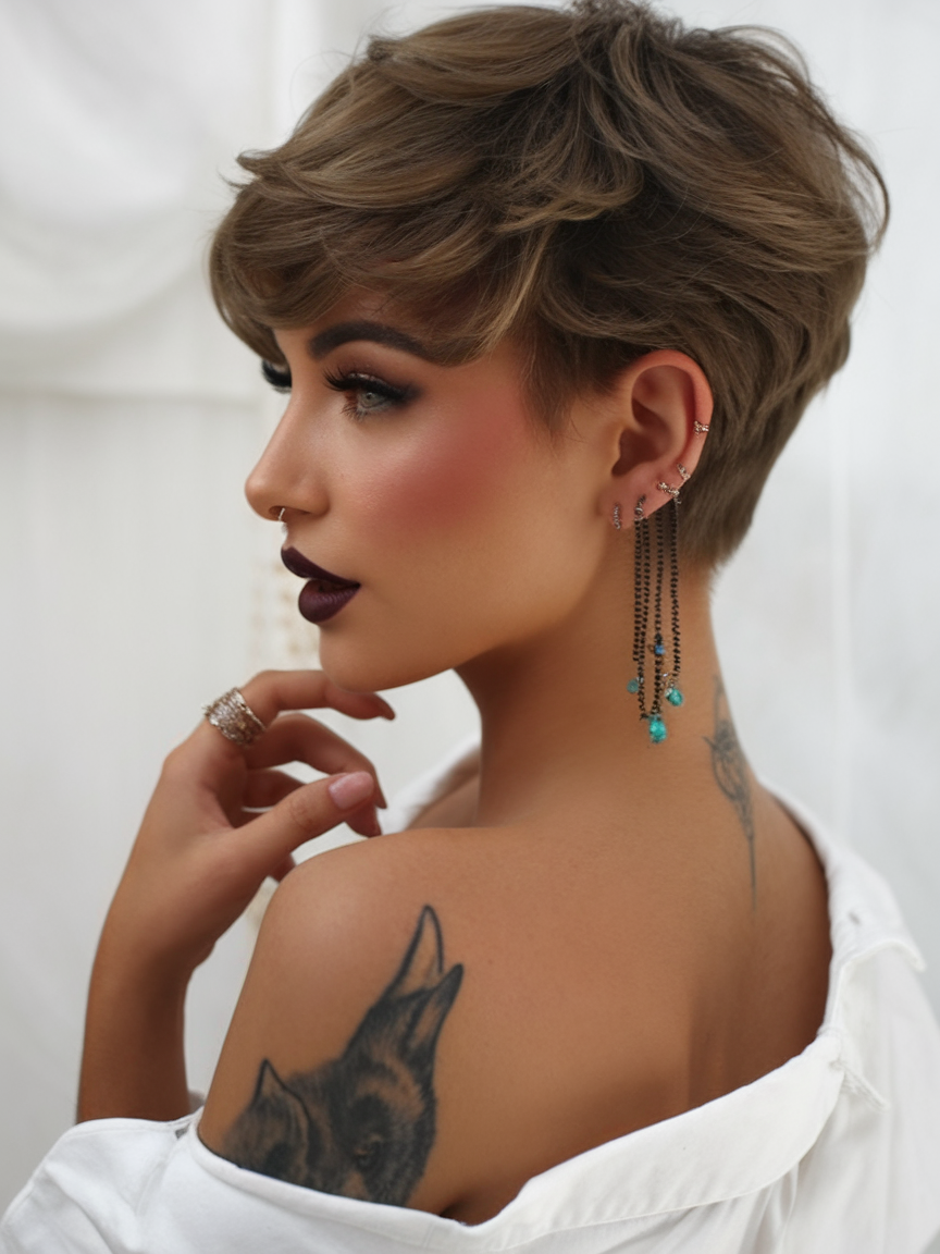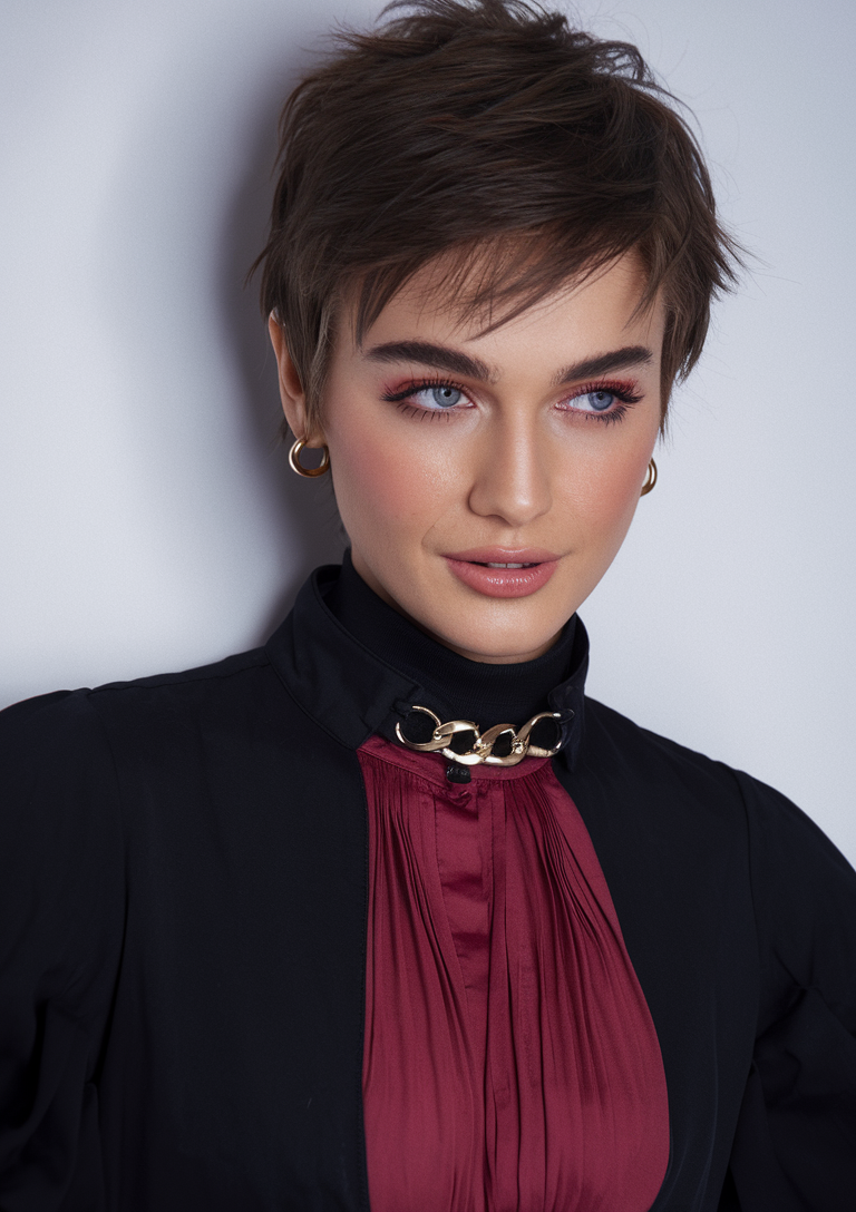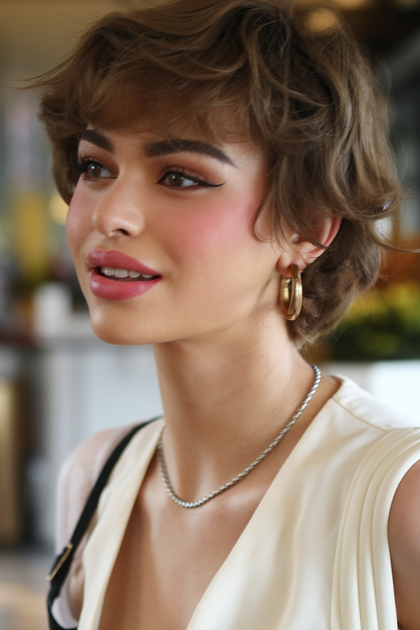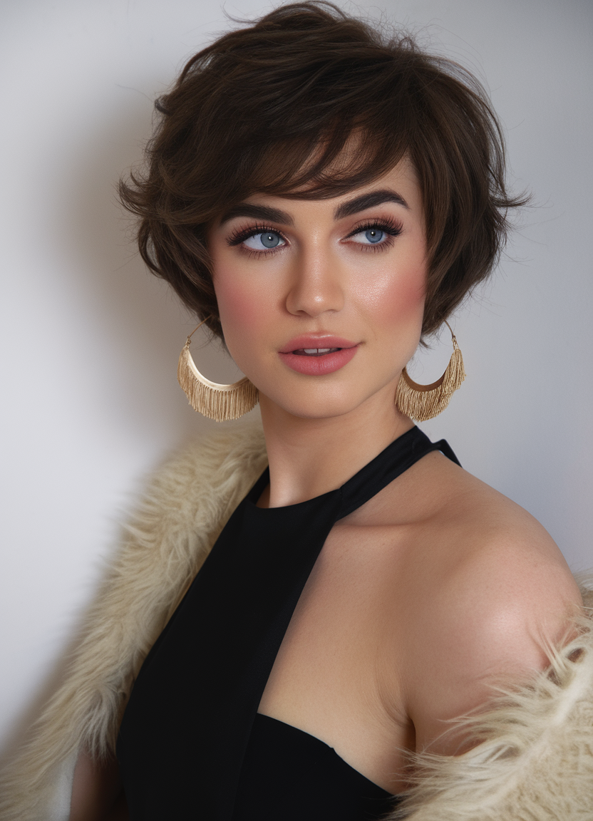 This tousled pixie cut combines playful layers with delicate feathered bangs for a soft and feminine look. The warm brunette tone complements the texture, creating a dynamic yet effortless style. Perfect for spring, this haircut is trendy and ideal for women seeking a low-maintenance yet fashionable option.