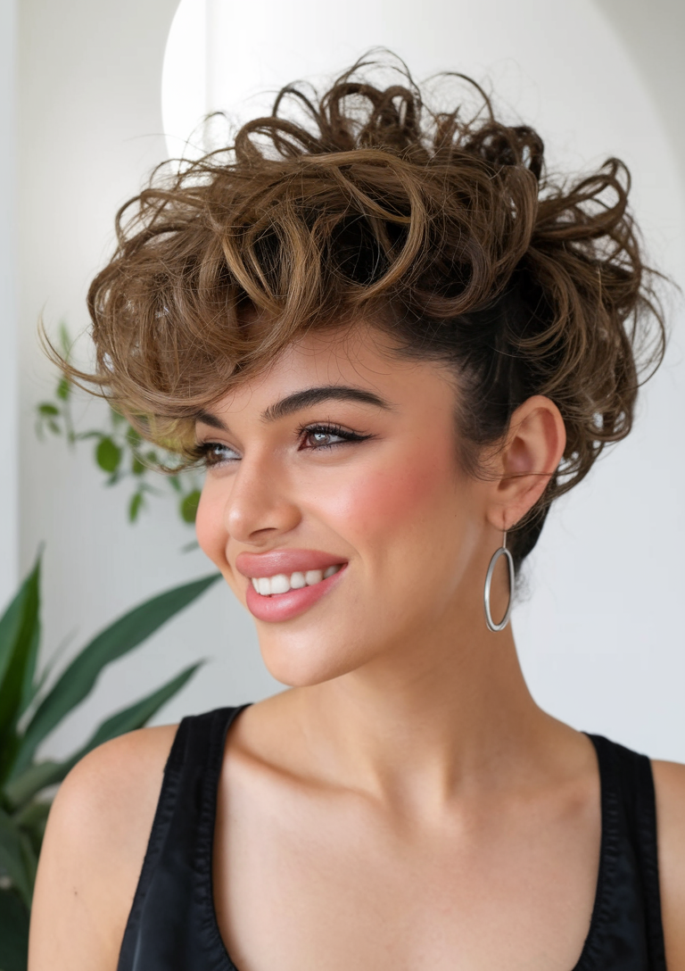 This curly pompadour is styled with voluminous, bouncy curls that add height and texture. The warm caramel highlights enhance the movement and create a multidimensional look. Perfect for women seeking a bold and trendy hairstyle, this cut is ideal for framing the face with a playful touch.