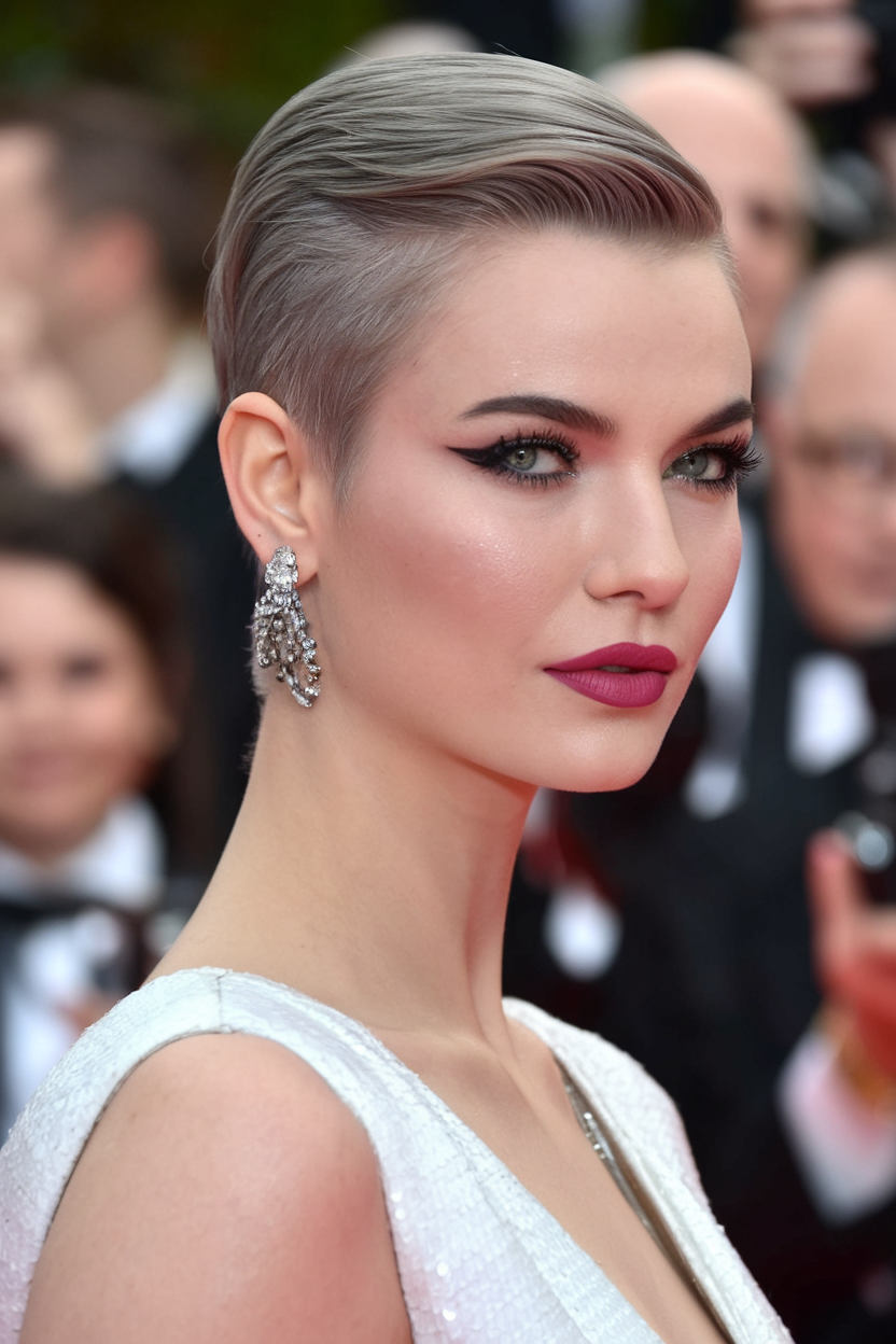 This sleek silver pixie cut is sharply styled with tapered sides for a clean and polished finish. The metallic silver tone adds a modern, edgy twist to this sophisticated look. It’s a perfect choice for women who appreciate bold, minimalist haircuts that showcase confidence and class.