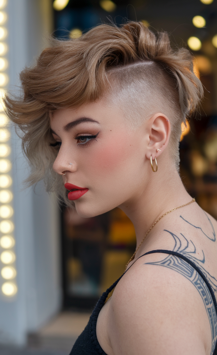 This undercut pixie combines a bold, shaved side with tousled waves on top for a dynamic and edgy style. The caramel blonde highlights add warmth and dimension, enhancing the playful texture of the waves. Perfect for women who want a daring and statement-making spring haircut.